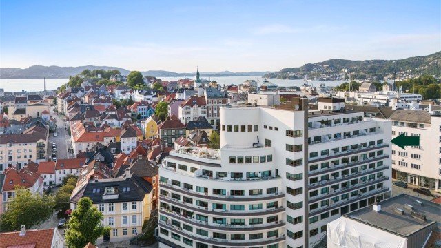 Stor lys 3-roms leilighet i ikoniske Kalmarhuset m/heis, p-plass og balkong med utsikt over Fløyen, byen, Ulriken og DNS