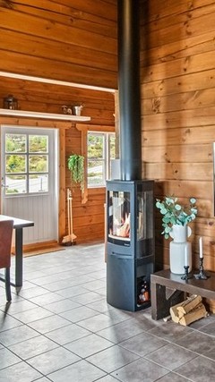 Hytta inneholder tre soverom – to med familiekøyesenger og ett med dobbeltseng. Stue og kjøkken ligger i en åpen og sosial løsning, med god soneinndeling som gir naturlige overganger mellom spiseplass, sofakrok og kjøkken. De store vindusflatene og den åpne himlingen gir rikelig med dagslys og en luftig romfølelse. I stua er det montert vedovn som gir deilig varme på kjølige dager. Kjøkkenet er innredet med fronter i kirsebærutførelse og integrerte hvitevarer, som medfølger. Det gjøres oppmerksom på at hvitevarene er fra byggeåret, og det må påregnes noe slitasje. Ventilator bærer stedvis preg av alder. Fra kjøkkenet er det direkte utgang til den store terrassen – perfekt for solrike dager og avslappende stunder.