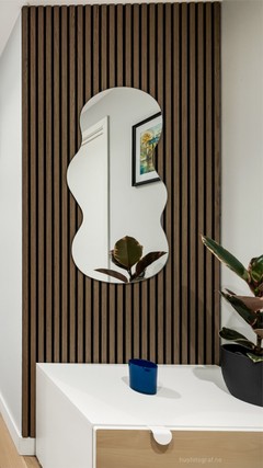 Entré/gang: Dørcalling med åpnerfunksjon. Downlights i tak. Parkett på gulv, malte vegger (akustikkpanel fra 2025) og malt himling. Tilgang til bod.