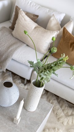 Stuen fremstår som svært romslig og gjennomgående lys, med store vindusflater som gir en åpen og luftig atmosfære. Her er det rikelig med plass til både sofagruppe og spiseplass, og den åpne planløsningen gir fleksible møbleringsmuligheter. De lyse flatene og den harmoniske utformingen gjør rommet lett å innrede etter egen stil.