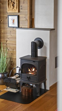 Peis med innsats i stuen og vedovn i tv-stue/soveromsgang.