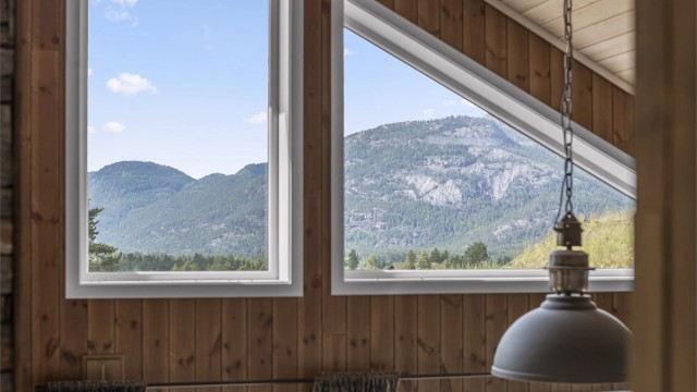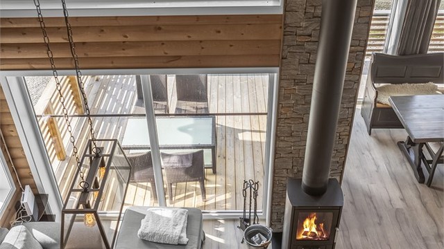 • Lys og moderne hytte med åpen himling og store vinduer som gir godt naturlig lys til oppholdsrommene