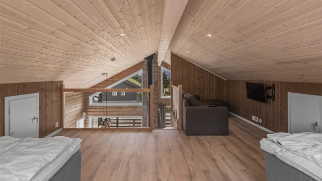 I stuen er det trapp opp til hemsen, som har glassfasade/rekkverk mot stuen og de store vindusflatene, slik at lyset slipper til også her. Det er på hemsen innredet med to dobbelsenger, men det er ikke godkjent til soverom/varig opphold pga rømning og lav takhøyde. Dog et praktisk rom til for eksempel ungdommen å kunne trekke seg tilbake.