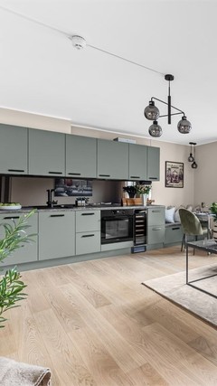 Keo kjøkkeninnredning fra 2022 med slette fronter, laminat benkeplate og integrerte hvitevarer bestående av ovn, induksjonstopp, kjøl/frys, vinskap og oppvaskmaskin. Benkeskapsbelysning under overskap og komfyrvakt er installert for trygghet.