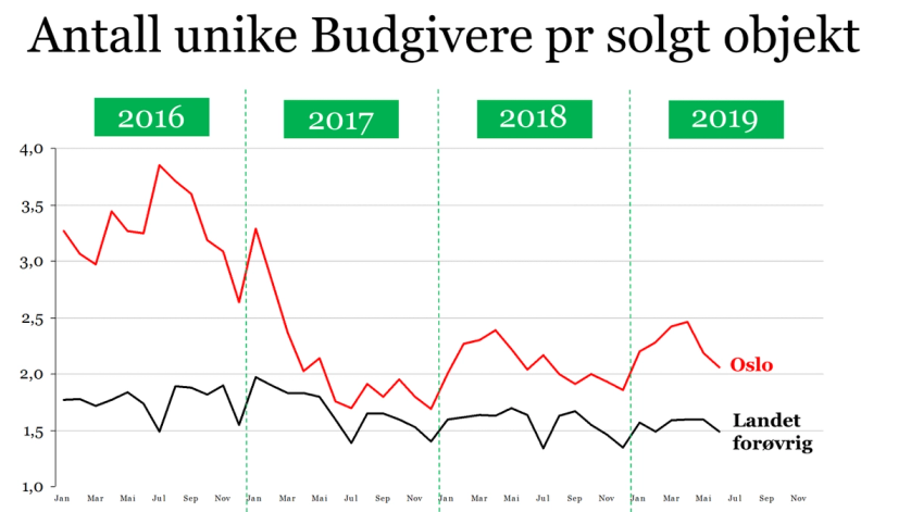 En viktig indikator på temperaturen i boligmarkedet er antall unike budgivere pr objekt som selges. Gjennom at Krogsveen normalt omsetter om lag 150-250 boliger i uka, hvorav 50-80 i Oslo, kan vi systematisk lese av hvor hett markedet er. Juni-tallene for Oslo viser vel 2,0 unike budgivere, mens det var 1,5 unike budgivere pr solgt objekt i resten av landet.