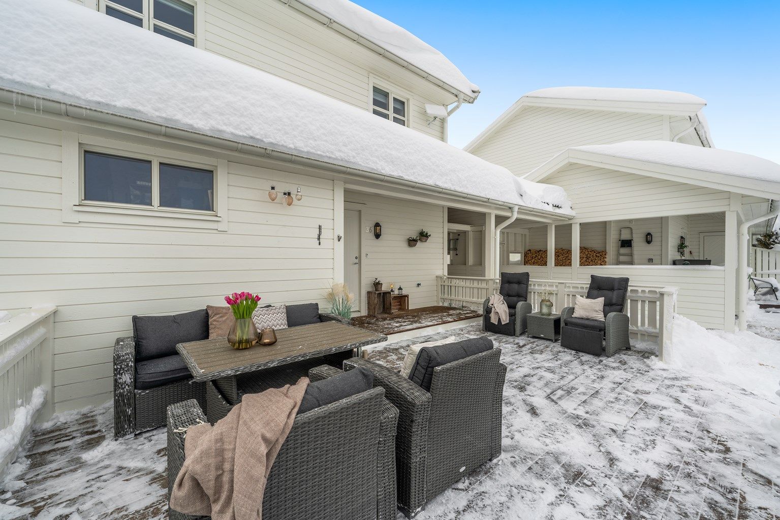 Boligen går over to plan med en gjennomgående god og arealeffektiv planløsning. I 1. etasje er det lys entré, romslig stue og kjøkken i åpen løsning, flislagt bad med gulvvarme og bod brukt som vaskerom. I 2. etasje er det TV-stue, tre gode soverom og et flislagt bad. Solrike uteplasser på begge sider av boligen og parkering i carport. Oppført i 2013 og bærer preg av å være godt ivaretatt.
