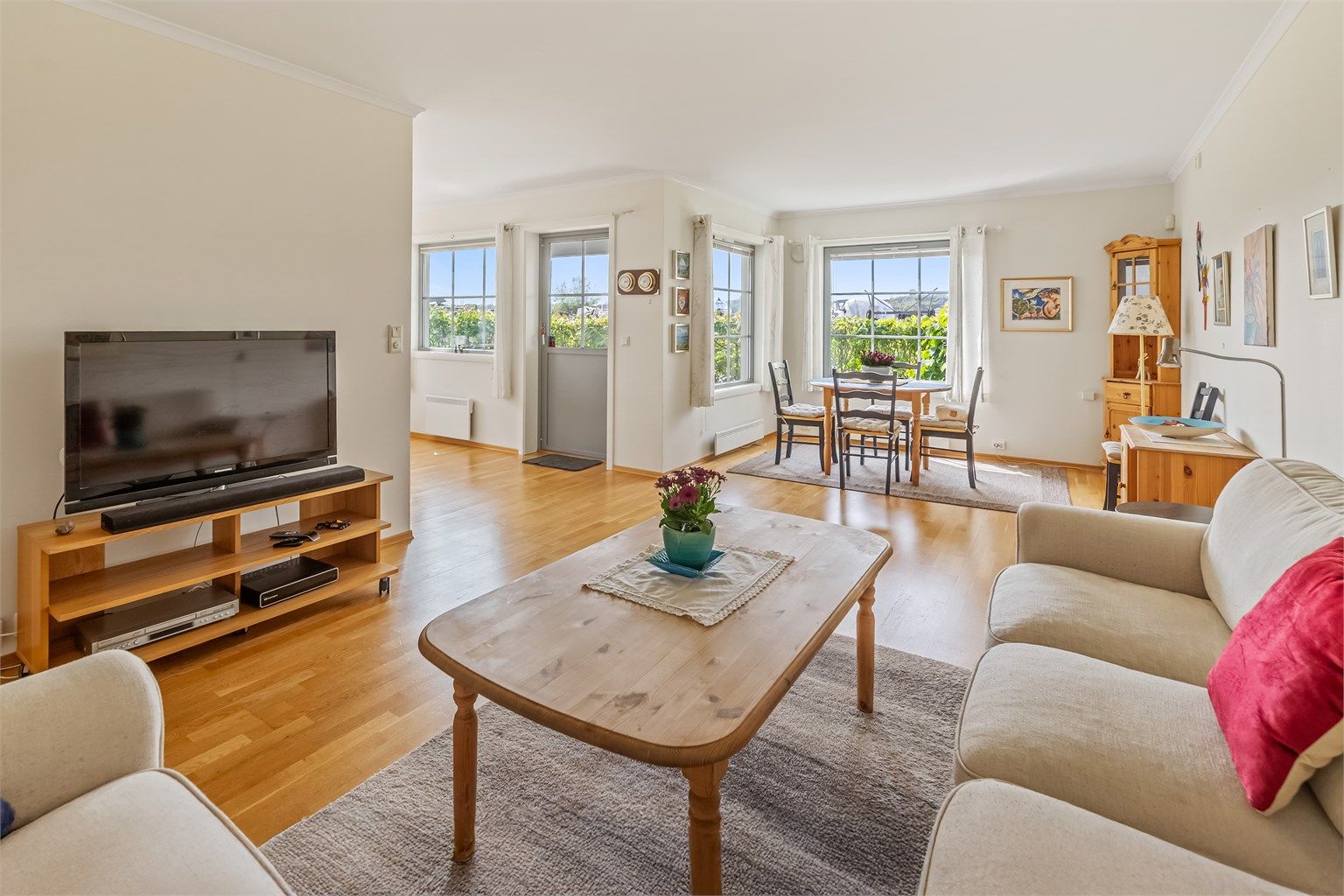 Lys og innbydende leilighet med en gjennomtenkt og arealeffektiv planløsning. Den koselige stuen har en åpen kjøkkenløsning og direkte utgang til terrasse og hage – perfekt for late sommerdager. Store vindusflater gir godt med naturlig lys og flott utsyn. Inneholder også 2 soverom begge med garderobeskap, flislagt bad med servant, dusjkabinett, wc og opplegg til vaskemaskin, samt bod.