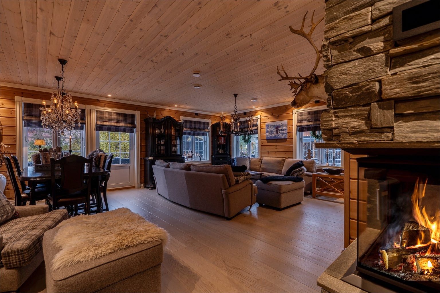 Hytta er meget romslig og rommer plass til hele storfamilien. Hytta fremstår lun, moderne og svært innbydende. Her kan du kjøre rett inn i garasjen og nyte hyttelivet med flere solrike uteplasser.