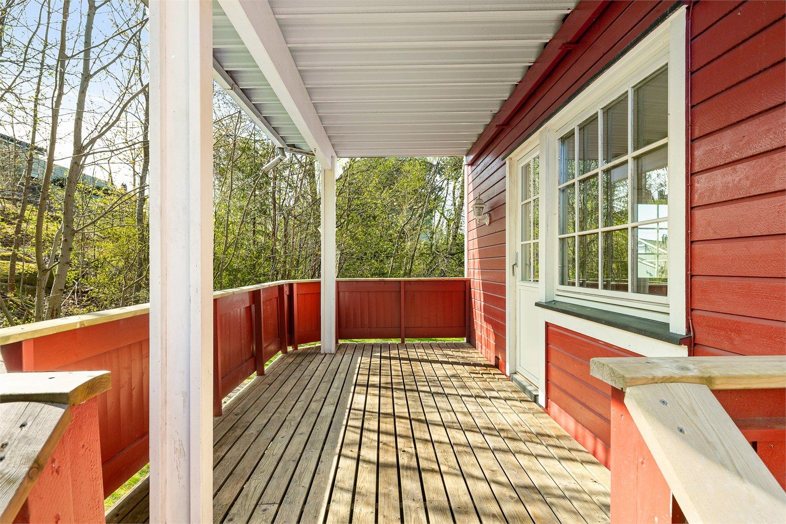 Terrasse orientert bort fra gaten og mot morgen-/formiddagssolen