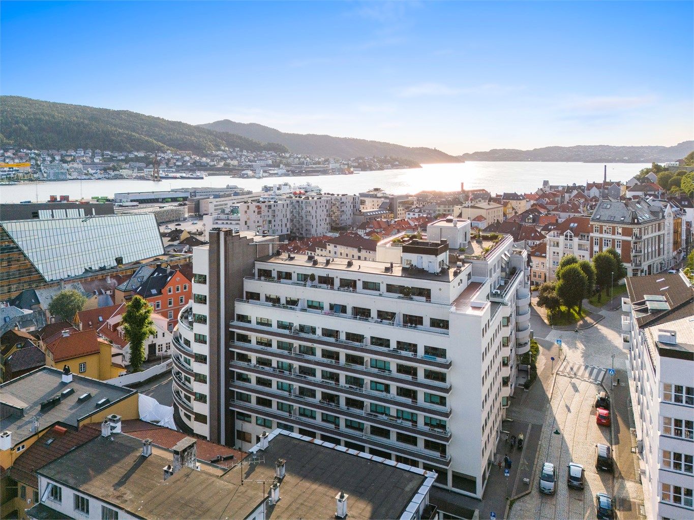 Stor lys 3-roms leilighet i ikoniske Kalmarhuset m/heis, p-plass og balkong med utsikt over Fløyen, byen, Ulriken og DNS