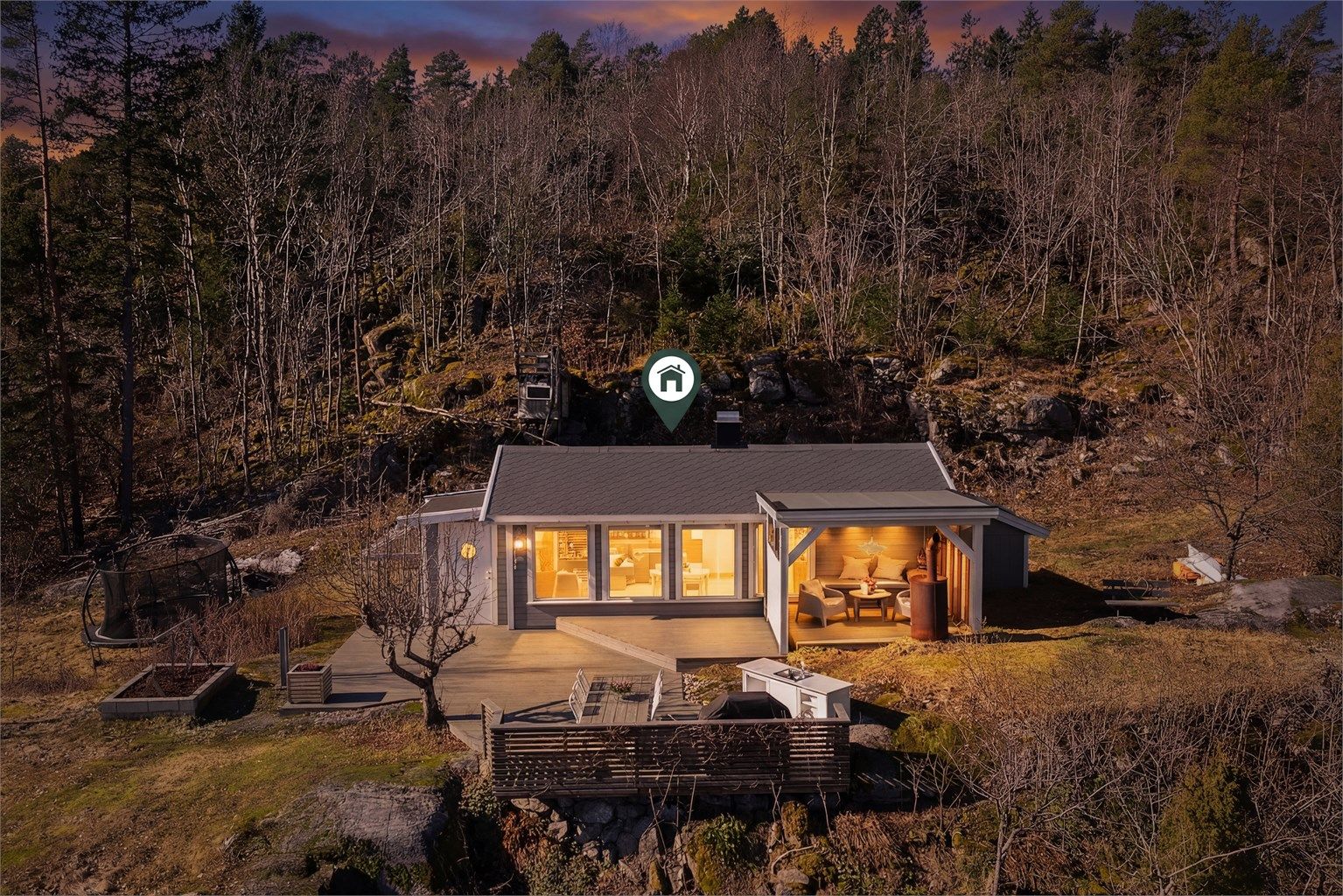 På Sandøya utenfor Brevik ligger denne hytta høyt og fritt med bilvei frem og nydelig utsikt utover sjøen. Hytta ble påbygget i i 2017, noe som ga en verdifull arealøkning og bedre bruksfunksjoner, samt en harmonisk fasade. Hytta har en grunnflate på litt over 70 kvadratmeter og rommer stue, kjøkken og spiseplass i åpen løsning, samt to soveromsavdelinger med til sammen 4 soverom. I tilknytning til to av soverommene i tilbygget er det TV-stue og ved inngangen er det et lite bad. Det at hytta ligger på en øy med adkomst med egen båt er fint, men øya har også egen bilferge og passasjerferge forbindelse med Brevik.