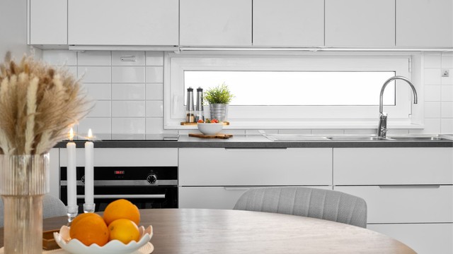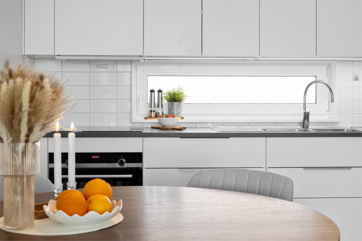 Lyst og funksjonelt kjøkken i åpen løsning mot stue, som gir en luftig og sosial romfølelse. Kjøkkeninnredning fra byggeår med stilrene, slette fronter og praktisk laminat benkeplate. Nedfelt oppvaskkum i rustfritt stål med ettgreps armatur. Flislagt felt mellom benk og overskap gir et ryddig og lettstelt uttrykk. God belysning under overskap samt flere stikkontakter gjør kjøkkenet både praktisk og brukervennlig. Kjøkkenet er utstyrt med frittstående kjøleskap med frysedel, integrert oppvaskmaskin og komfyr, samt nedfelt induksjonstopp tilkoblet komfyrvakt. Ventilator i overskap med avtrekk til kanal. Mekanisk avtrekk på vegg. Vannrør av typen rør-i- rør. Synlige avløpsrør av plast