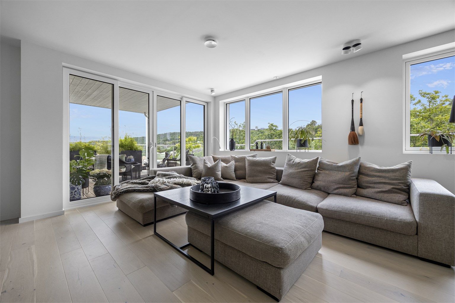 Leiligheten har adkomst fra bakkeplan med entré og garderoberom i 1. etasje, samt trapp opp til 2. etasje hvor det er gang, mellomgang, to boder, stue, spisestue, kjøkken, to bad og tre soverom, samt eget garderoberom i tilknytning til hovedsoverommet. Dette er en helt unik beliggenhet med lite innsyn og bred utsikt. Det er sol på terrassen fra morgen til ca. kl. 20:30 midtsommers. Leiligheten har blitt tilrettelagt for et behagelig hverdagsliv med påkostet belysning, automatisk utvendig solskjerming (screens), integrerte hvitevarer og mye mer. Det tilhører også en fellesbod og egen parkering i felles carport.