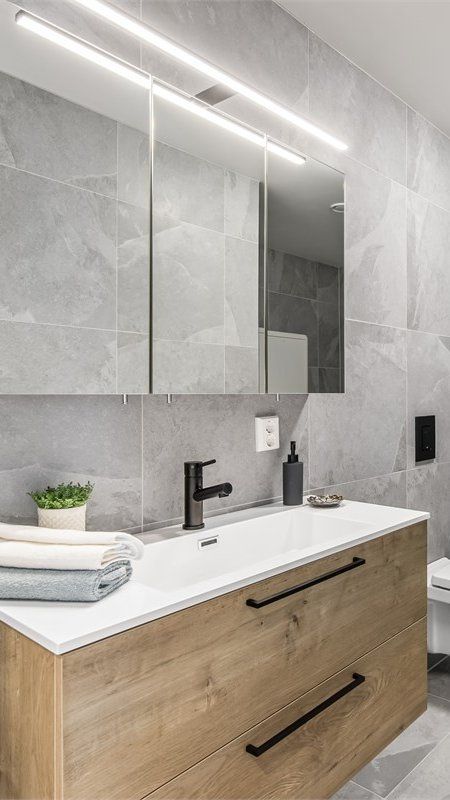 Badet er romslig, med varmekabler i gulv og innredet med dusjhjørne (dusjvegger kan slåes inn for plassbesparelse), servant i innredning med skuffer og overskap med speil, vegghengt toalett samt opplegg til vaskemaskin/tørketrommel.