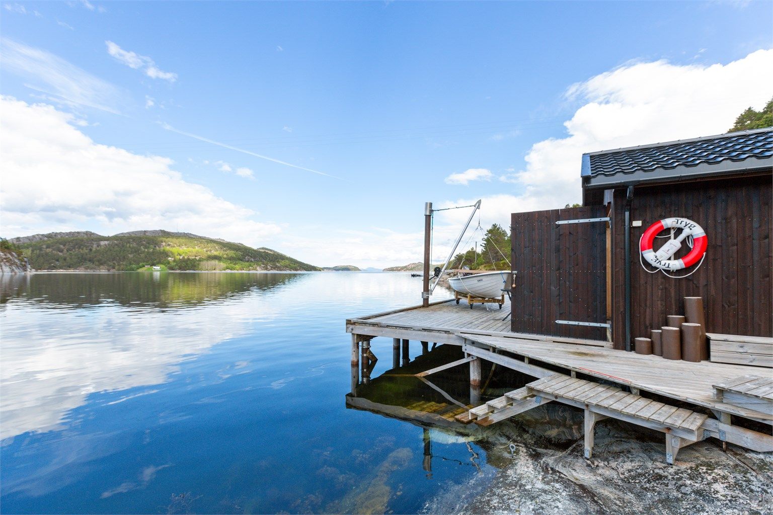 Stort naust fra 2014 på 22 kvm anlagt på felles brygge med totalt tre naust. Det er innlagt strøm til naustet.