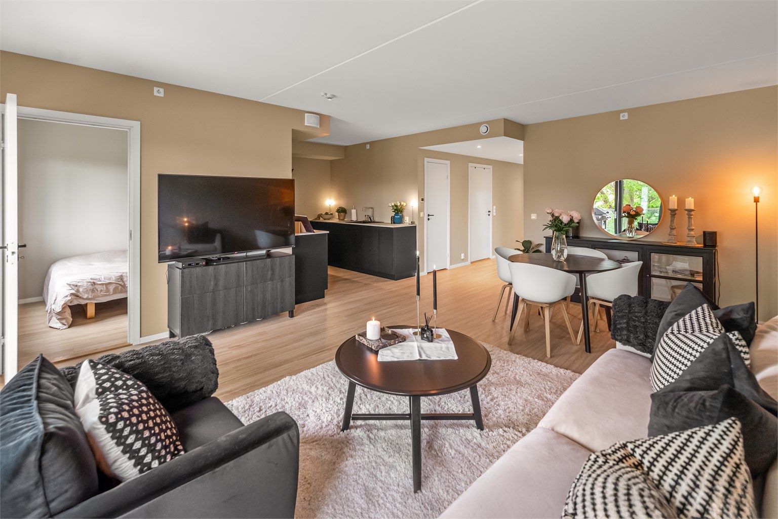 klosett, opplegg til vaskemaskin og dusjhjørne. Et separat toalettrom med vegghengt klosett, servant og speil ligger også til entré og soverom. Det er åpen løsning fra spisestue og stue til kjøkkenet som har innredning på 2 sider. Kjøkkenet har en stilig innredning med godt med benkeplass over innredningen med kolonialskuffer og integrert steketopp, komfyr, oppvaskmaskin og kjøl-/frys samt en stilig ventilator som går via ventilasjonsanlegget. Utenfor stuen ligger en romslig, overbygget balkong. Det 3. soverommet ligger til stuen. For mindre familier kan dette rommet være et tv-rom eller et flott kontor. Det er også en innvendig bod i skille mellom kjøkkendelen og badeværelset. I sommerhalvåret er fine sitteplasser utendørs, ved det egne inngangspartiet og på balkongen hvor det er fin plass til utemøblement og grill.