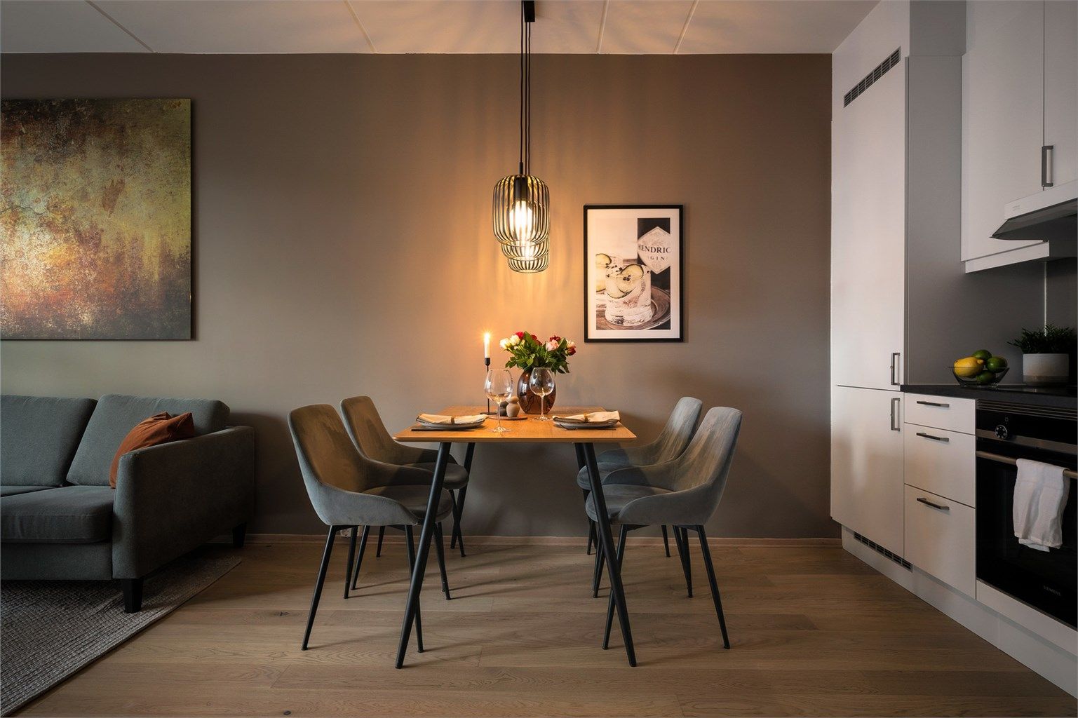 Stuen er romslig og har god plass til sofagruppe med tilhørende salongbord, TV-sjenk eller annet ønskelig stuemøblement. Store vindusflater sørger for rikelig med lysinnslipp og bidrar til en lys og luftig atmosfære i boligen. I fin overgang mot kjøkkenet er det også god plass for å innrede med et spisebord med gode muligheter for å invitere venner og familie på middag.