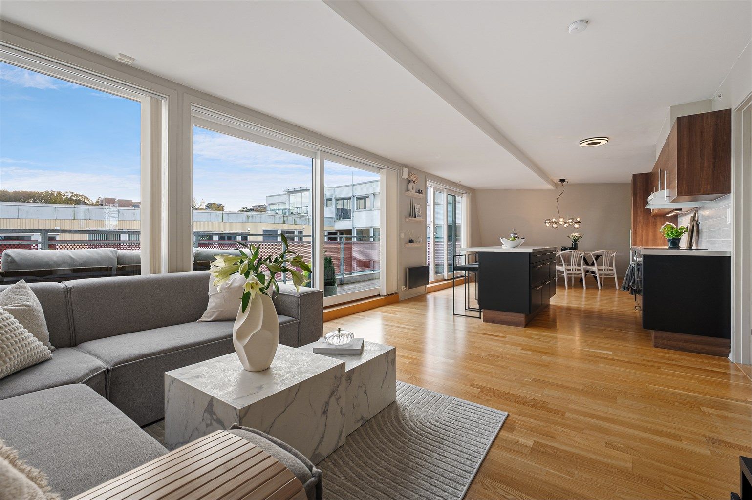 Åpen og lys stue/kjøkkenløsning med store vindusflater, utsikt samt utgang til balkong