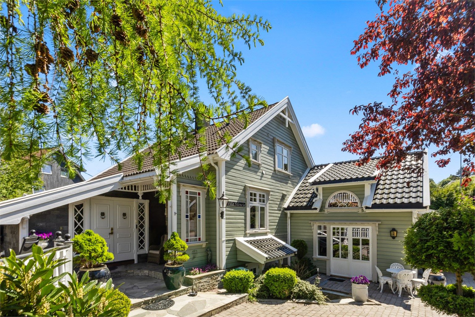 Her får du en tomt som er opparbeidet ned til hver minste detalj. Her oser det gjennomført og velholdt med innholdsrike og solrike uteområder, flere usjenerte terrasser og utekjøkken.