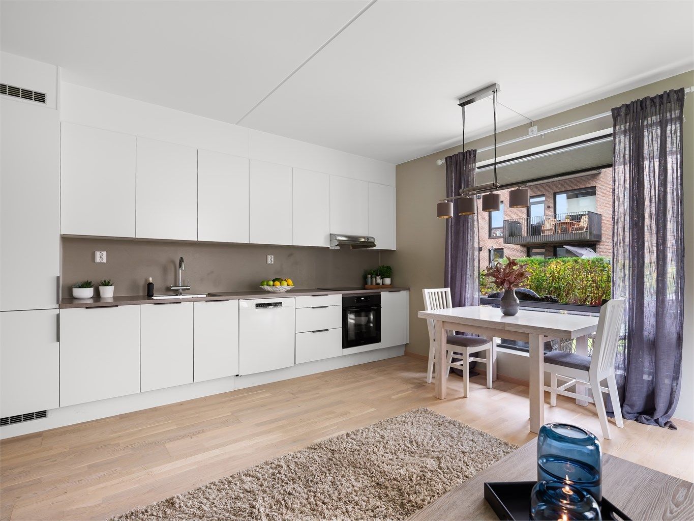 Meget fin og åpen kjøkkenløsning med standard fra 2021. Innredningen består av slette fronter og benkeplate av laminat. Nedfelt oppvaskkum med ett-greps kjøkkenarmatur. Benkeskapsbelysning og stikkontakter over kjøkkenbenk. Utstyrt med integrert stekeovn, platetopp, oppvaskmaskin og kjøleskap med fryser samt vegghengt ventilator. Vannrør av typen rør-i-rør system.