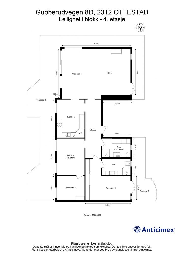 Vedlagte plantegninger er ikke målbare. De oppgitte arealer er hentet fra rapport med befaringsdato 20.03.2026 utført av Anticimex AS v/Marius Rognstad. Arealene er beregnet og rom er definert etter dagens faktiske bruk, uavhengig av hva som er godkjent av bygningsmyndighetene.