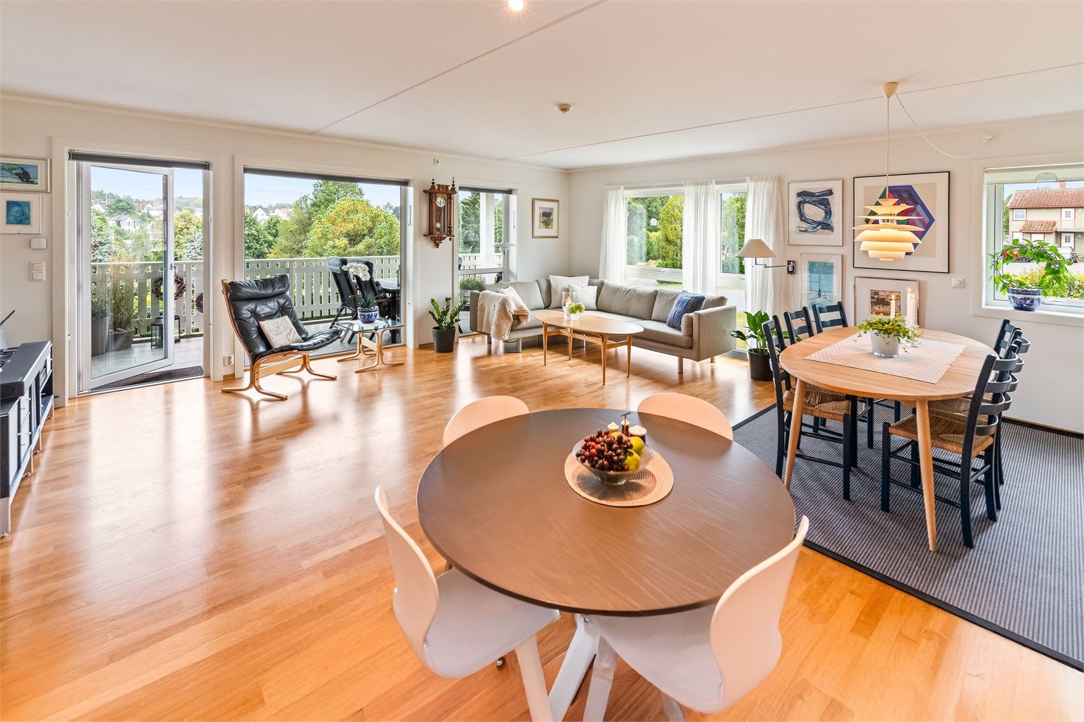 Åpen stue løsning mot kjøkken med meget god plass til både sofagruppe, stor spisestue og god stolen. Utgang til stor overbygget balkong.