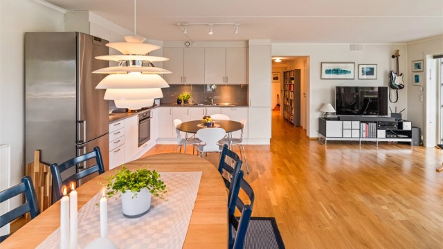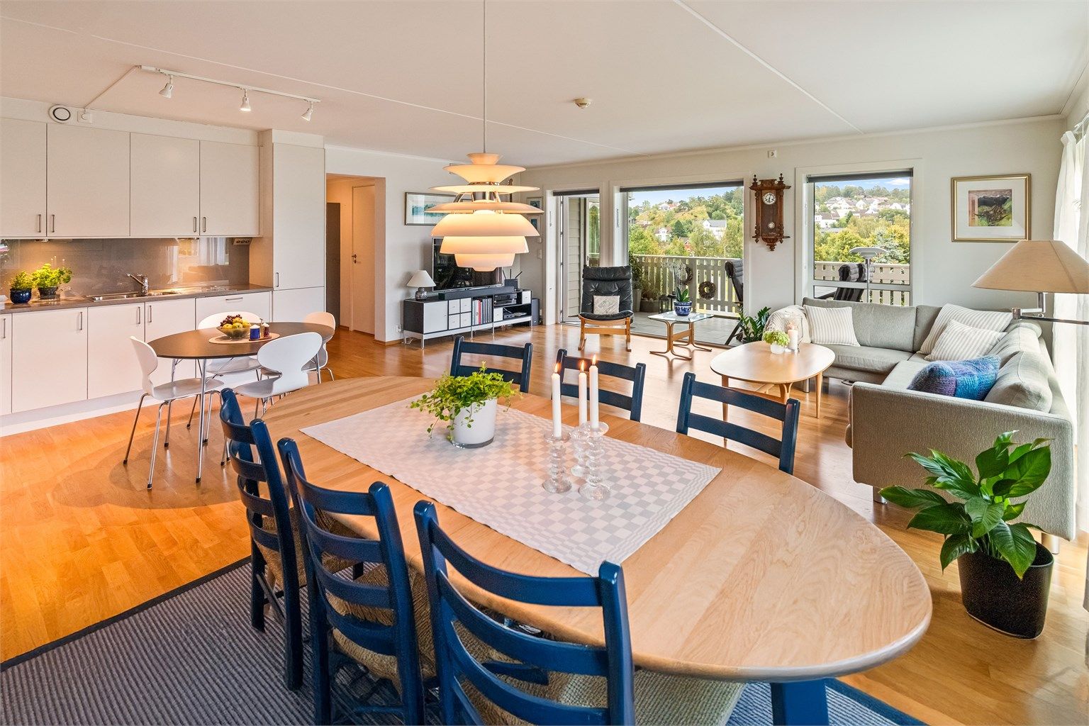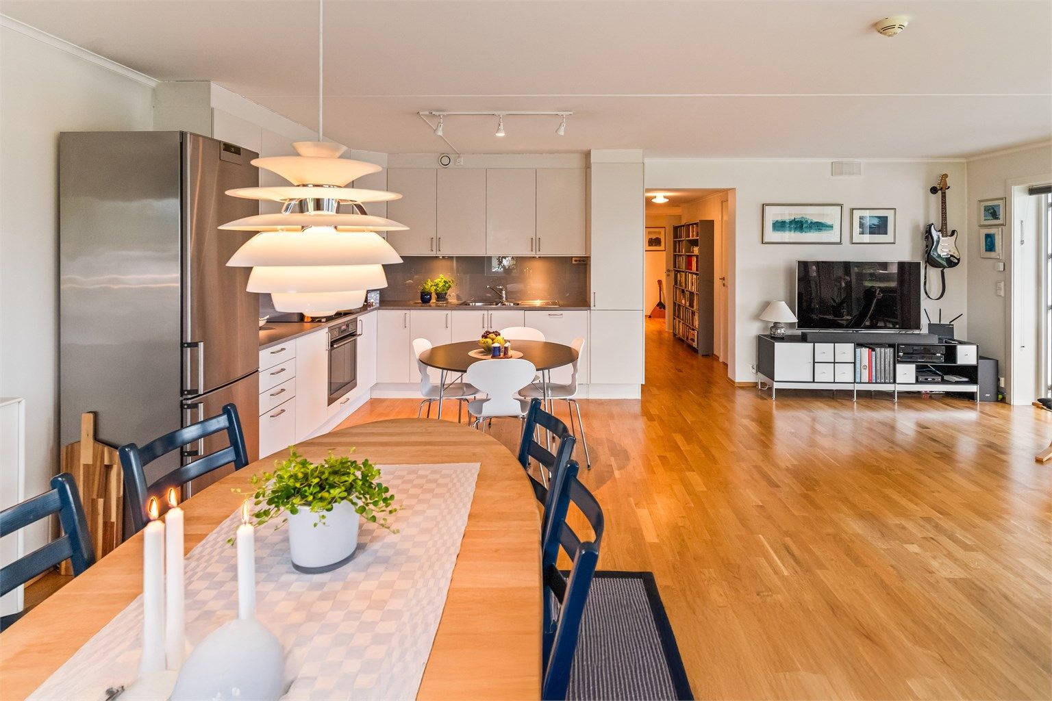 Leiligheten ligger i 2. etasje med trappefri adkomst og heis fra garasje. Den byr på en moderne og gjennomtenkt planløsning med tre luftige soverom, god romfølelse og store vindusflater som slipper inn rikelig med dagslys.
