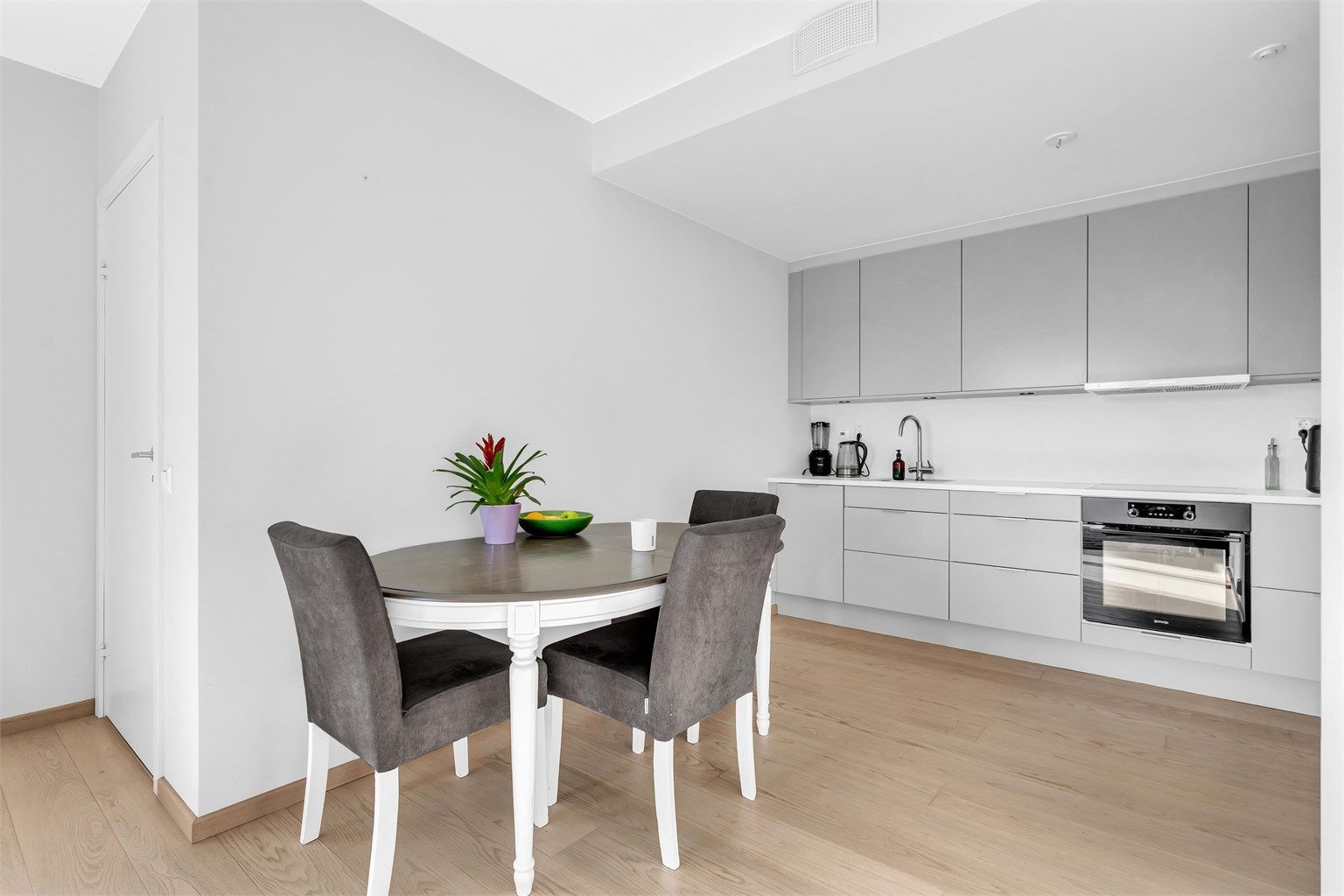 Moderne og høy standard med fine løsninger og lyse farger. Kjøkkenet har integrerte hvitevarer og plass til spisebord.