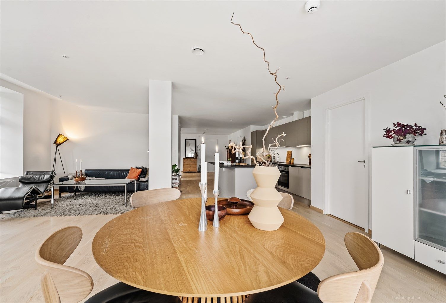 Kjøkken: Moderne og delikat HTH-kjøkkeninnredning med helintegrerte hvitevarer. Over- og underskap i glatt utførelse. Tilsvarende utførelse på en praktisk kjøkkenøy som har barløsning og en arbeidsbenk av god størrelse. Lysarmaturer under overskap. Benkeplater av laminat. Videre er kjøkkenet utstyrt med kjøle-/fryseskap, oppvaskkum, fuktsensor med automatisk vannstopper, oppvaskmaskin, ventilator, komfyrvakt, platetopp og stekeovn. Parkett på gulv, malte vegger og malt himling. Tilgang til bod og en ekstra stue/gang med sittegruppe samt utgang til en balkong. Overbygget sydvestvendt balkong på ca. 4 kvm med terrassebord og utvendig belysning. Sol fra ca. kl. 14.00 til 21.00 (midtsommerstid) iflg. selger.