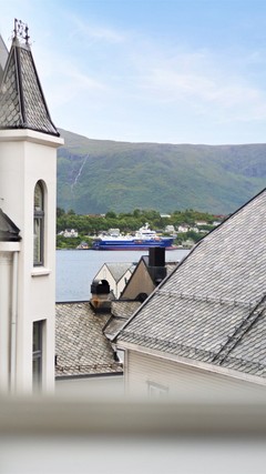 Vindusflaten mot syd som gir godt med lysinnslipp og en sjarmerende sentrumsutsikt over skifertak og glimt mot Aspevågen og Sulafjellet.