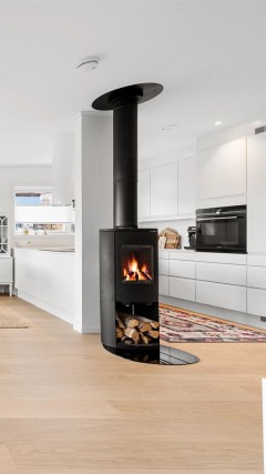 Lys og trivelig stue i åpen løsning mot kjøkkenet, et sosialt og luftig oppholdsrom med god plass til både spisebord og sofagruppe. Store vindusflater som gir godt med naturlig lysinnslipp. Det er utgang til sørøstvendt balkong på 11 kvm som dels er overbygd med flott utsikt mot fjord og fjell. På gulv er det lagt parkett i 2024, malte vegger og tak med downlights. Det er peisovn med glassdør i stuen som gir en lun og hyggelig atmosfære på kjølige dager.