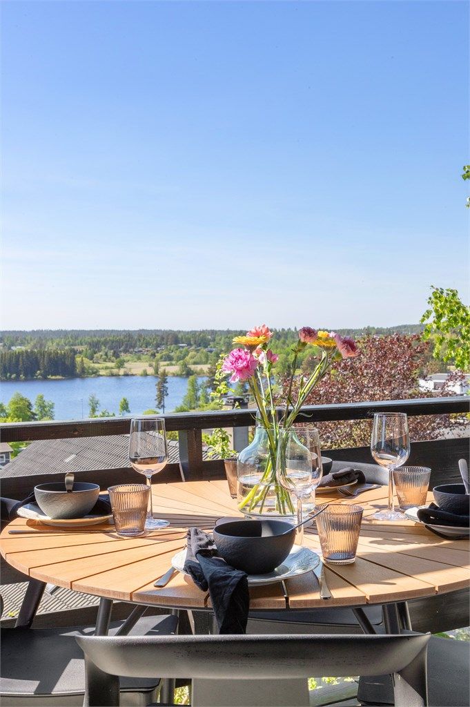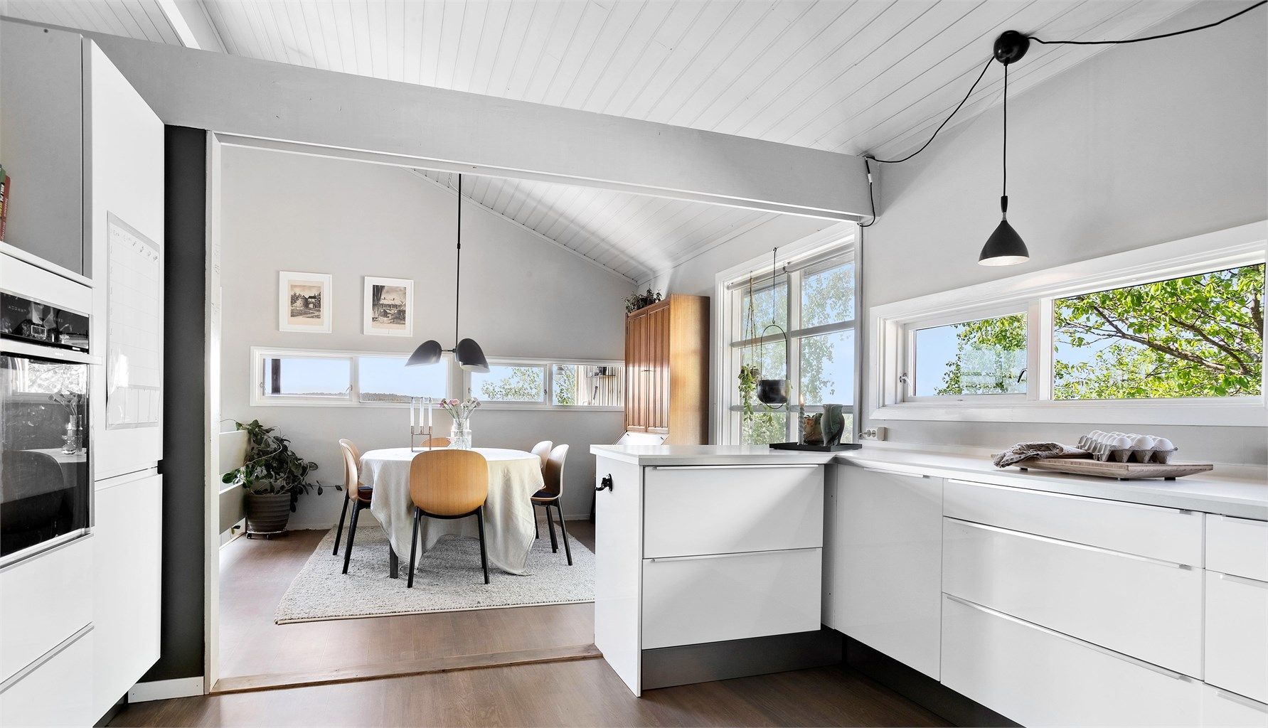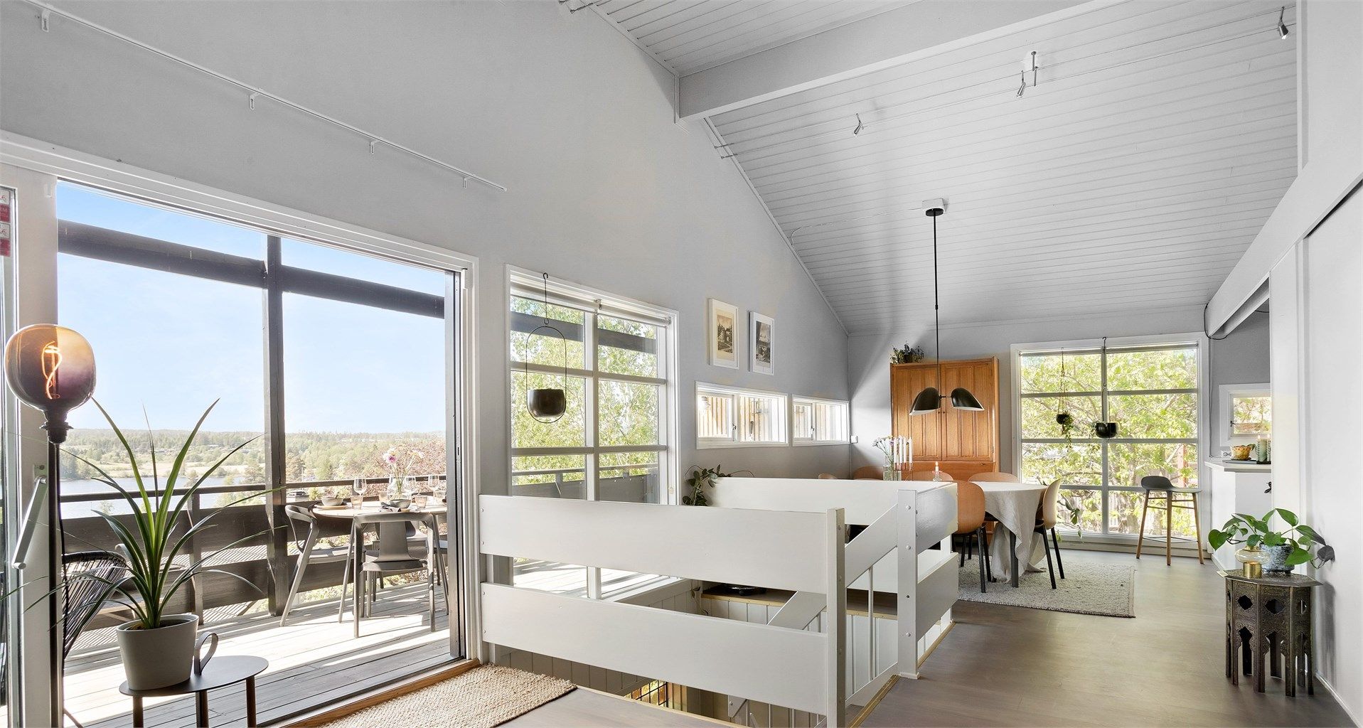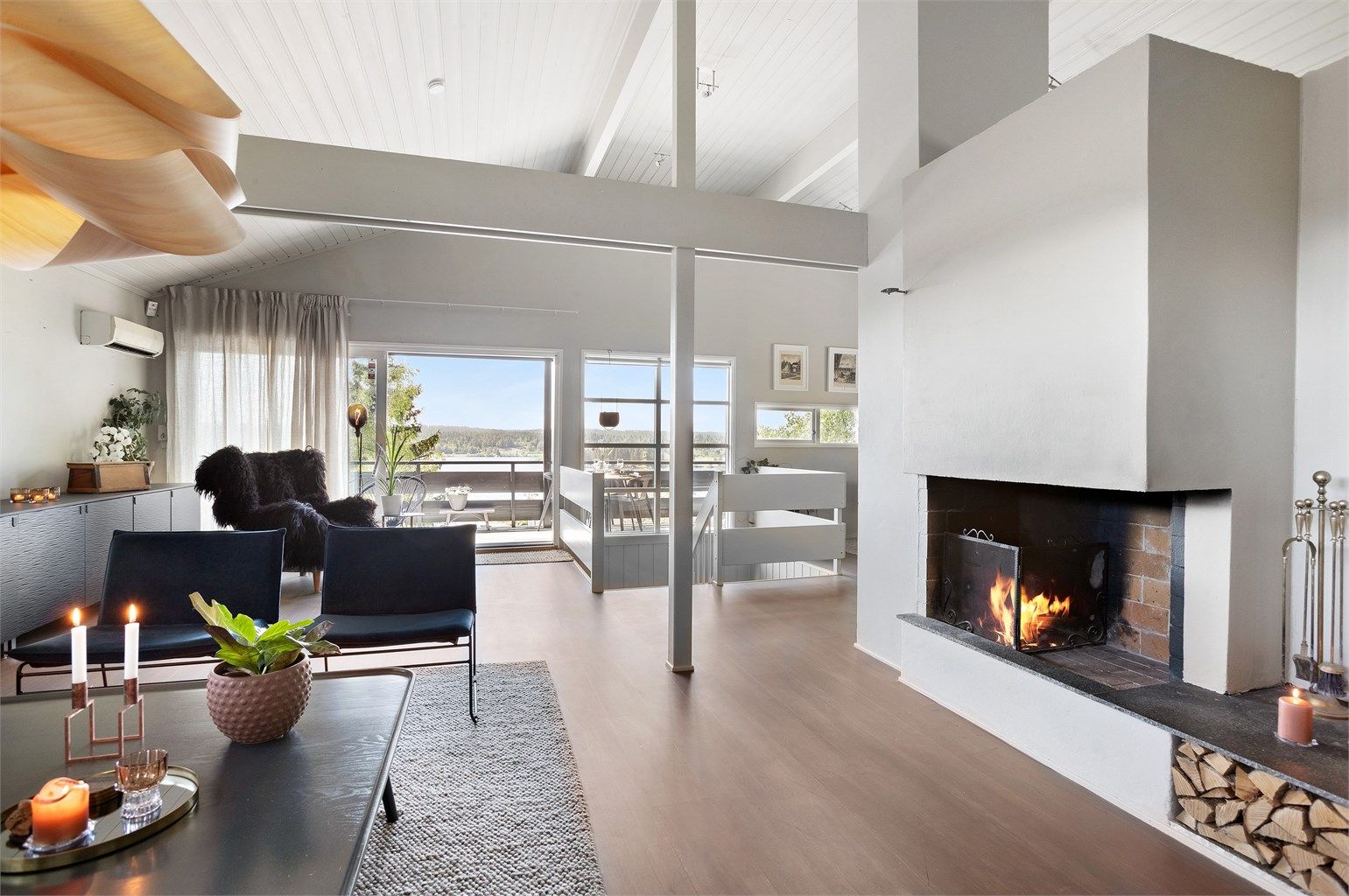 Innvendig fremstår boligen med en spennende arkitektur og planløsningen har en god rytme i seg. Hovedstuen og kjøkken har en åpen himling, noe som gir en veldig god atmosfære, samtidig som at du får maksimalt utbytte av utsikten.