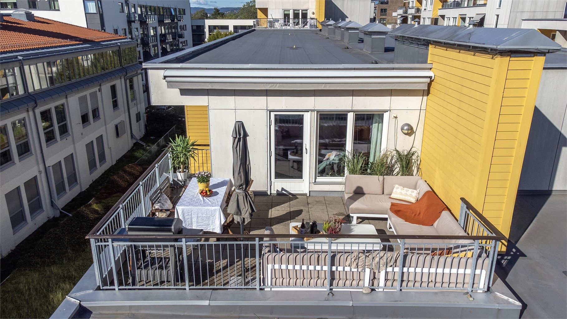 Innbydende 3(4)-roms toppleilighet med attraktiv beliggenhet. Garasje. Heis. Takterrasse på ca. 24 m². Balkong på 5 m²