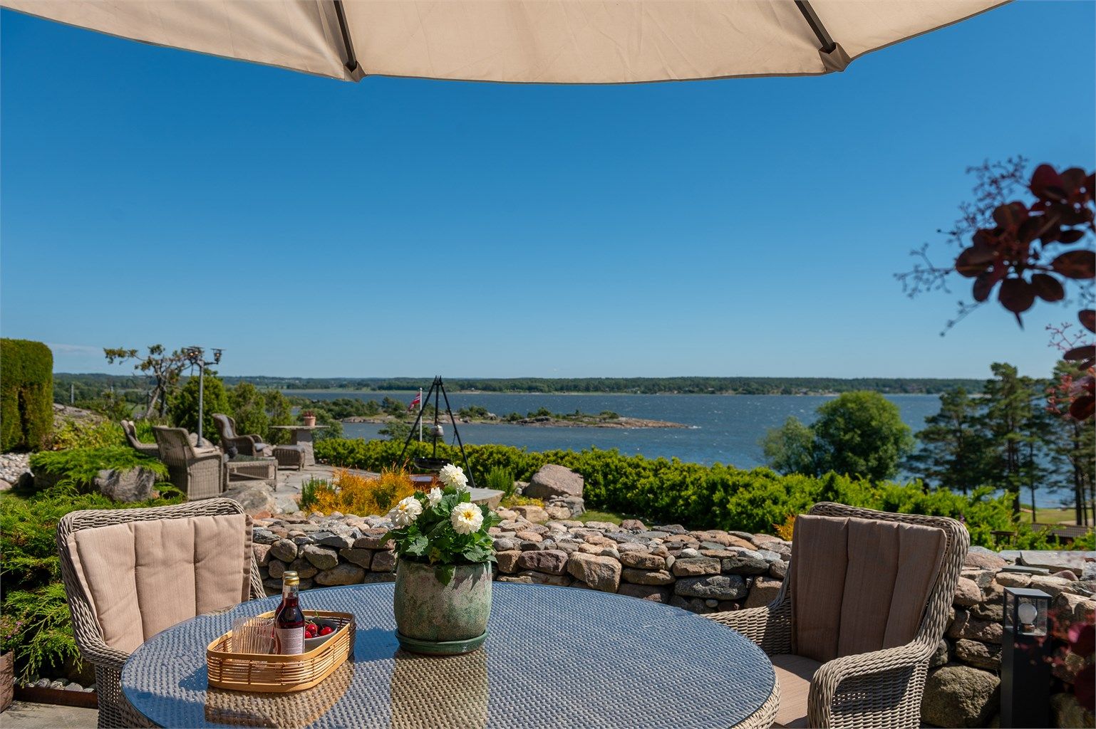 Påkostet fritidseiendom med sydlandsk atmosfære. Fantastiske, vedlikeholdsfrie arealer utomhus. Vid sjøutsikt. Solrikt.