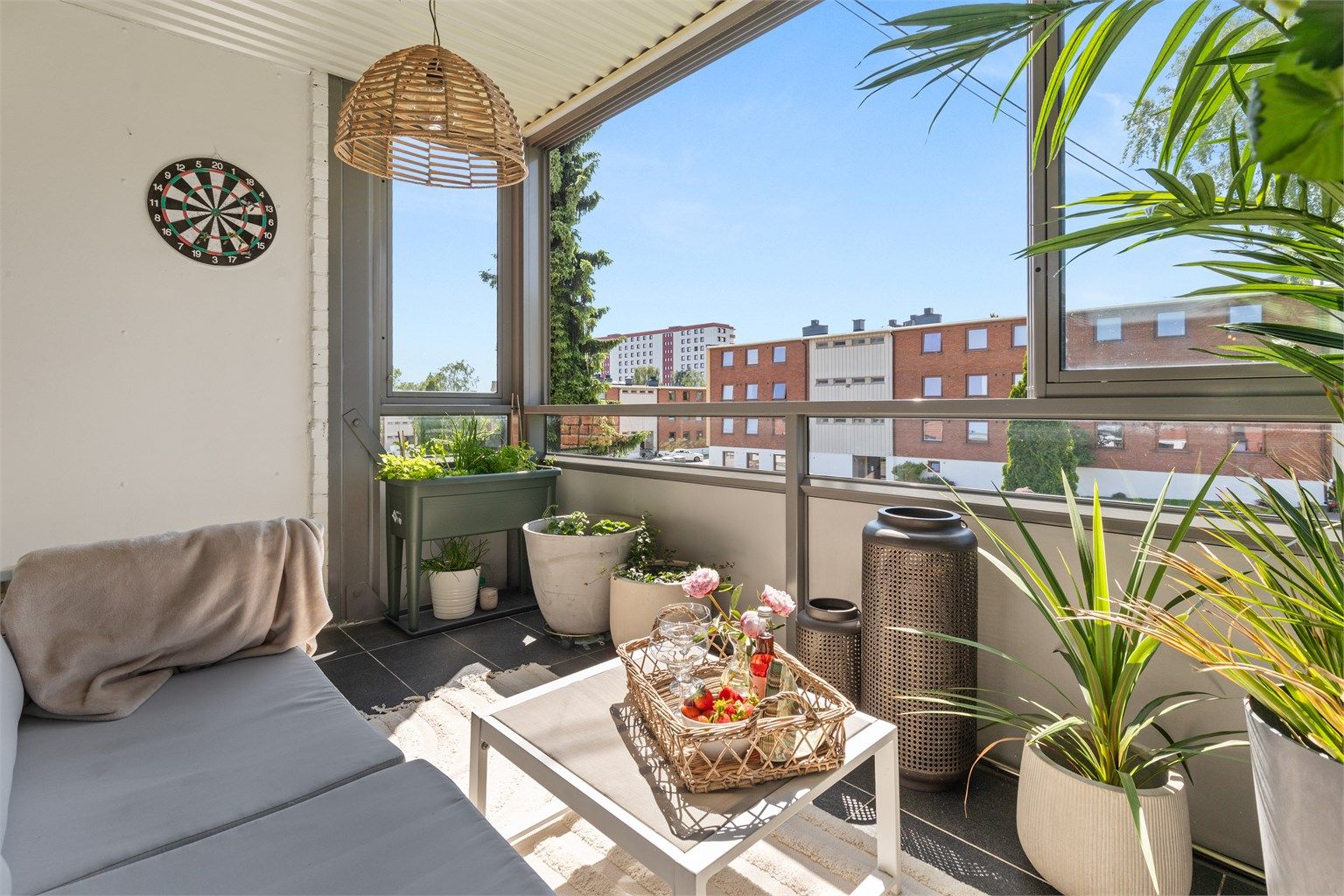 Solrik og innglasset balkong på 8 kvm med frodig utsyn