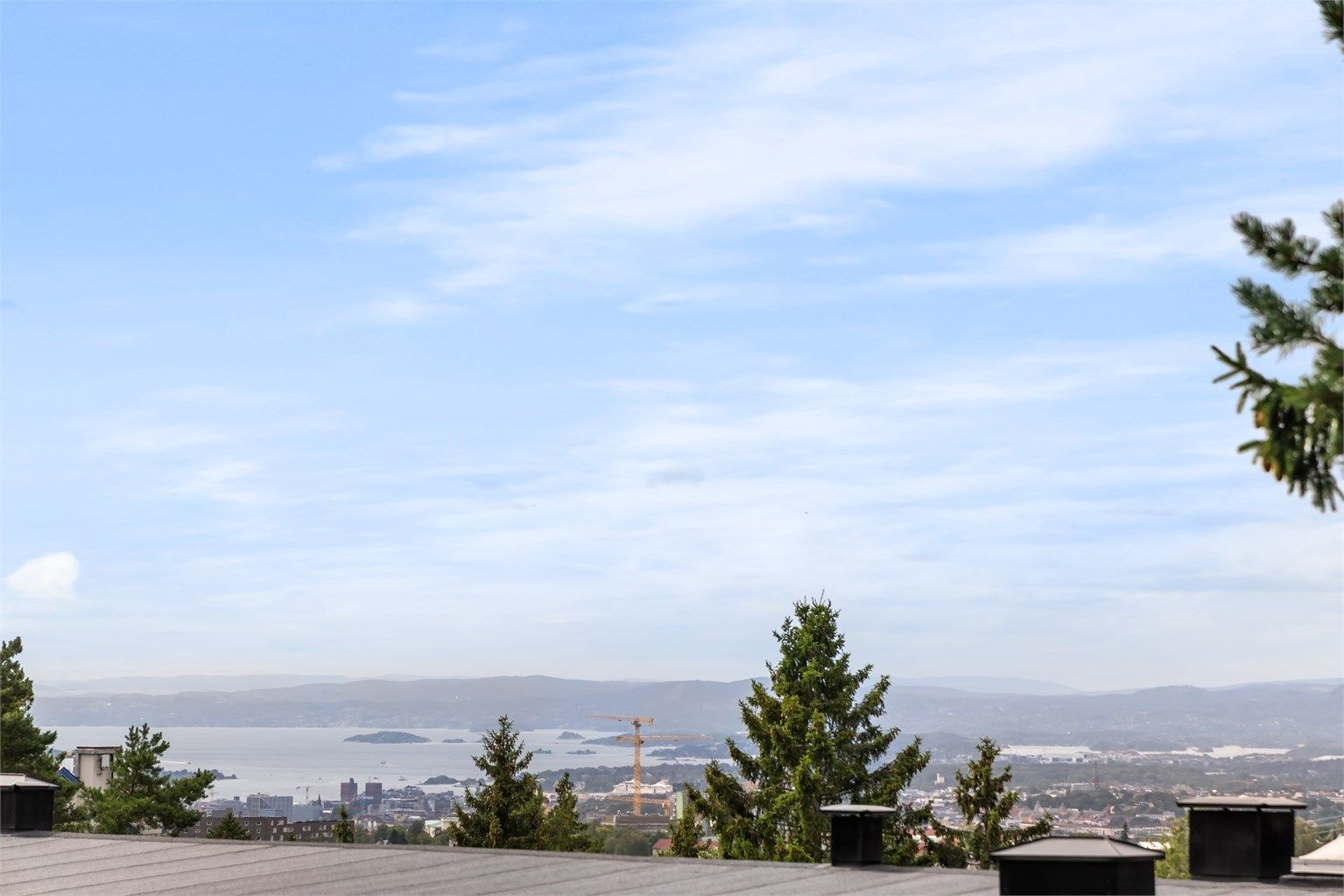 Sydvestvendt terrasse på 17 kvm med gode solforhold og fantastisk utsikt nedover mot fjord og by.