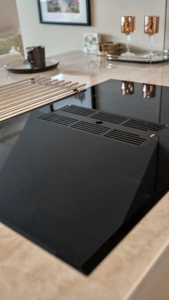 Meget stilfull kjøkkeninnredning med glatte fronter i en behagelig fargetone. Kjøkkenet er utstyrt med benkeplate i granittstein og underlimt kum for et rent og elegant uttrykk. Videre finner du induksjonstopp med integrert ventilator, samt integrerte hvitevarer som stekeovn, oppvaskmaskin, mikrobølgeovn, vinskap og kombinert kjøl/frys.