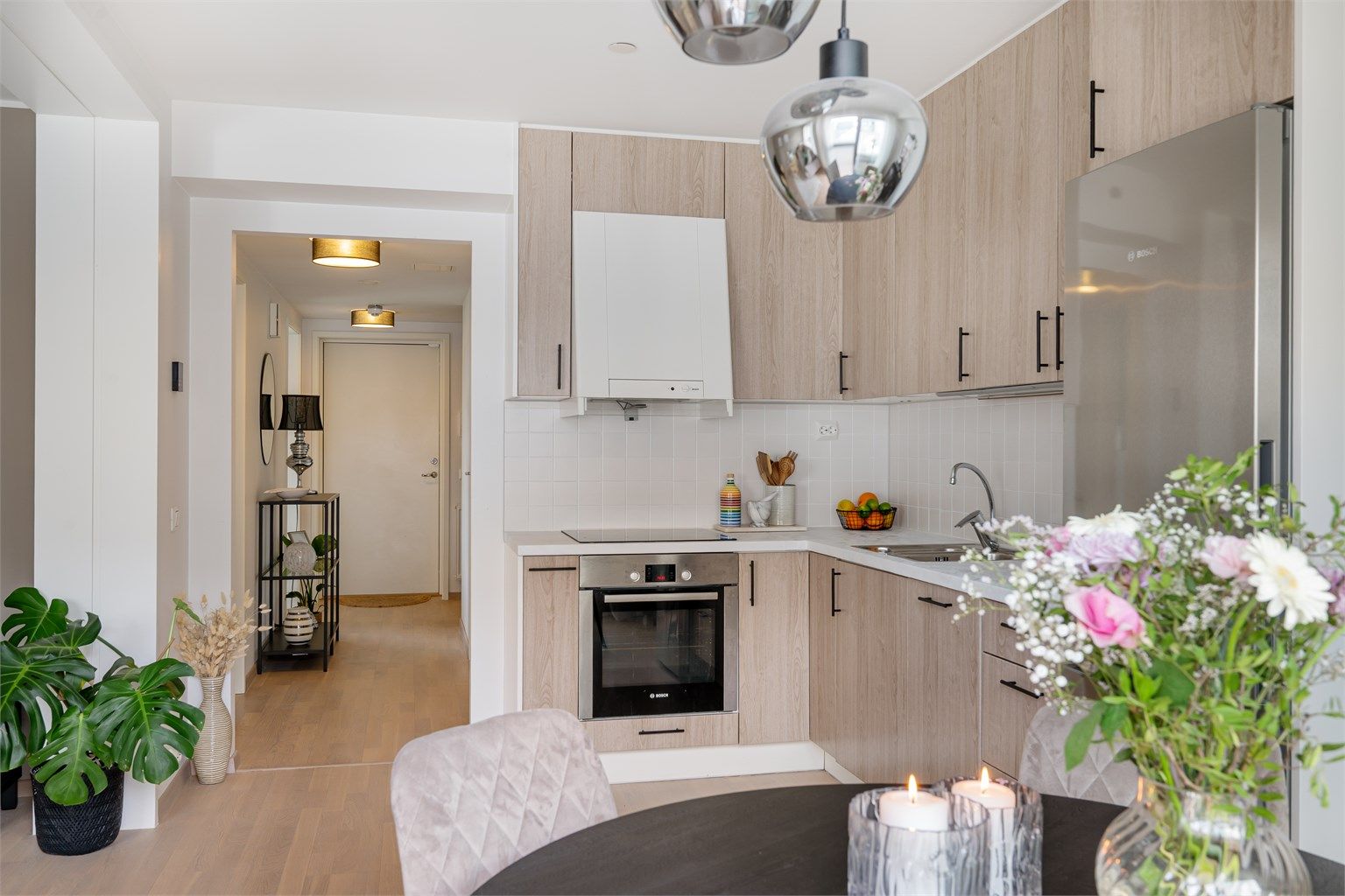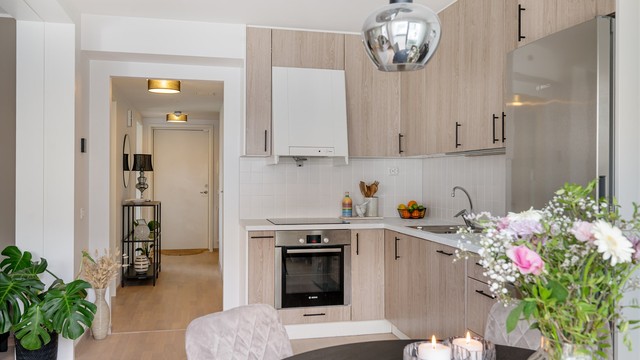 Lys og åpen kjøkkenløsning. Kjøkkeninnredning fra byggeår er oppgradert med folierte, glatte fronter og benkeplate i 2025, noe som gir et moderne og stilrent uttrykk. Kjøkkenet har laminert benkeplate, nedfelt kjøkkenvask med armatur, samt benkeskapsbelysning og gode stikkontaktløsninger over benk. Integrerte hvitevarer inkluderer stekeovn, platetopp og oppvaskmaskin, i tillegg til frittstående kjøleskap med fryser. Ventilator er plassert i overskap, og det er montert komfyrvakt for økt sikkerhet. Fliser mellom kjøkkenbenk og overskap gjør renholdet enkelt og bidrar til et helhetlig og pent uttrykk.