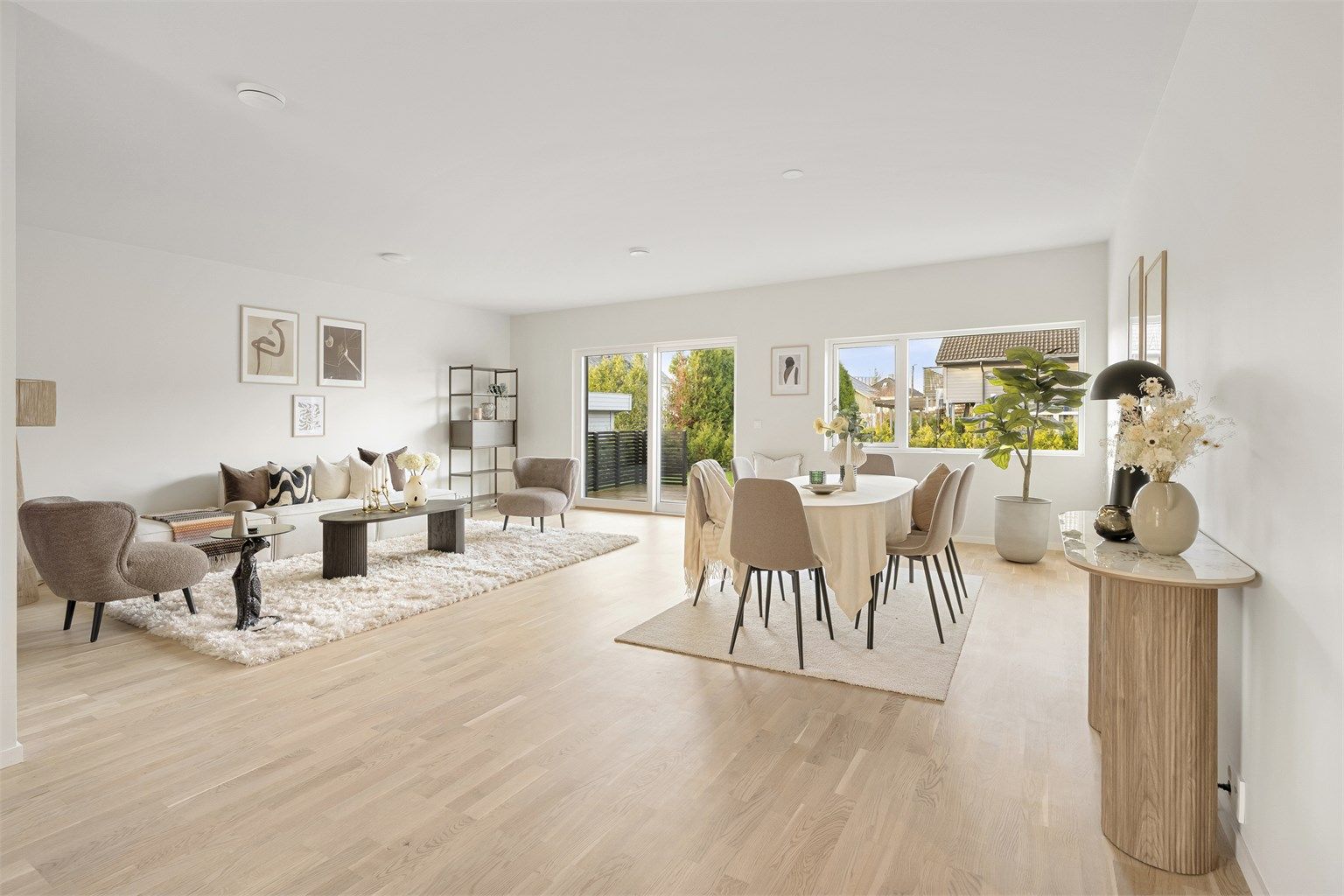 Stuen er åpen og romslig med plass til flere sittegrupper. Flere store vindusflater slipper inn mye naturlig dagslys. Her har man også direkte adkomst til boligens uteplass og hage.