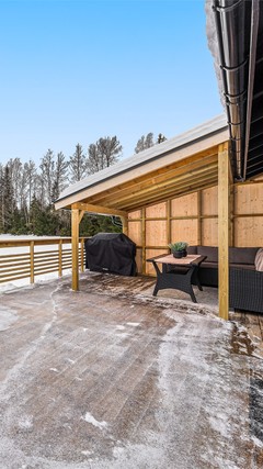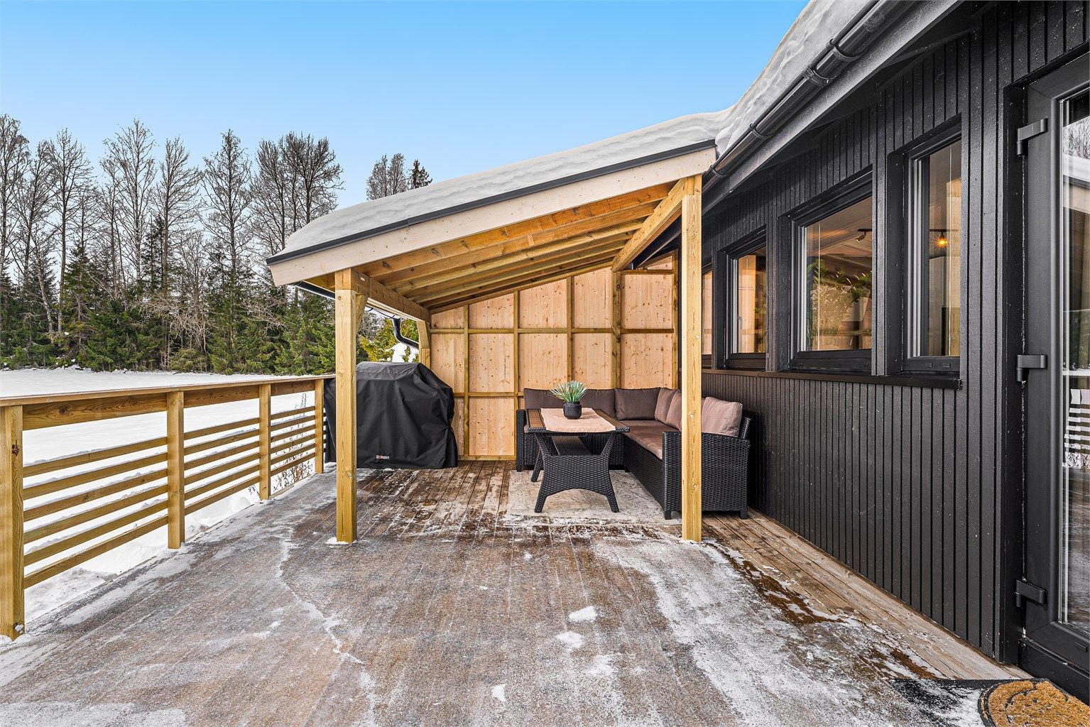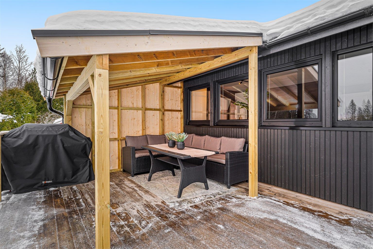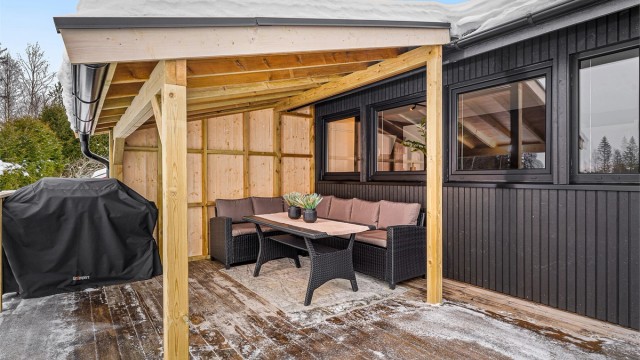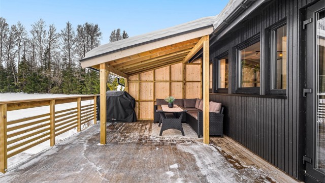 - Byttet rekkverk, satt opp levegg og tak over sittekrok på terrasse. Arbeidene er utført av Øvre Romerike Drift i 2025.