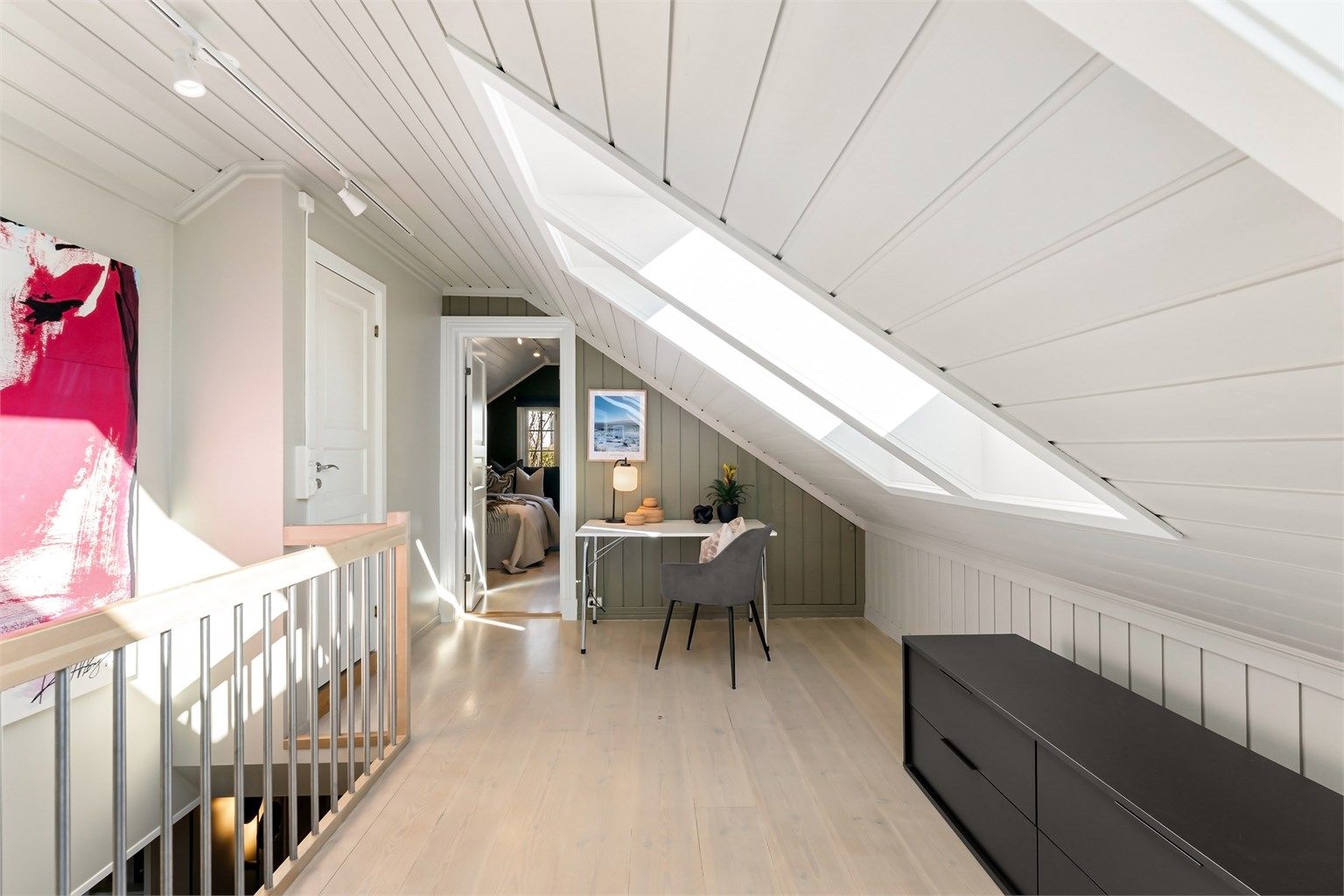 Loftetasje 45 kvm: Loftstue, toalettrom og to soverom.