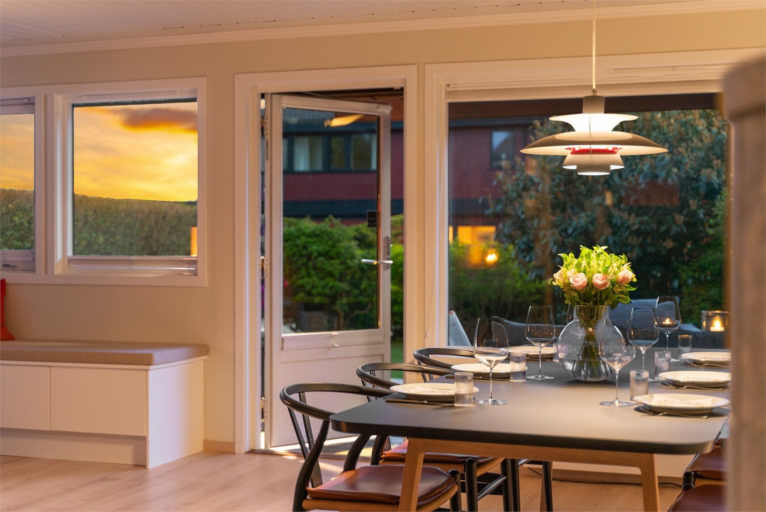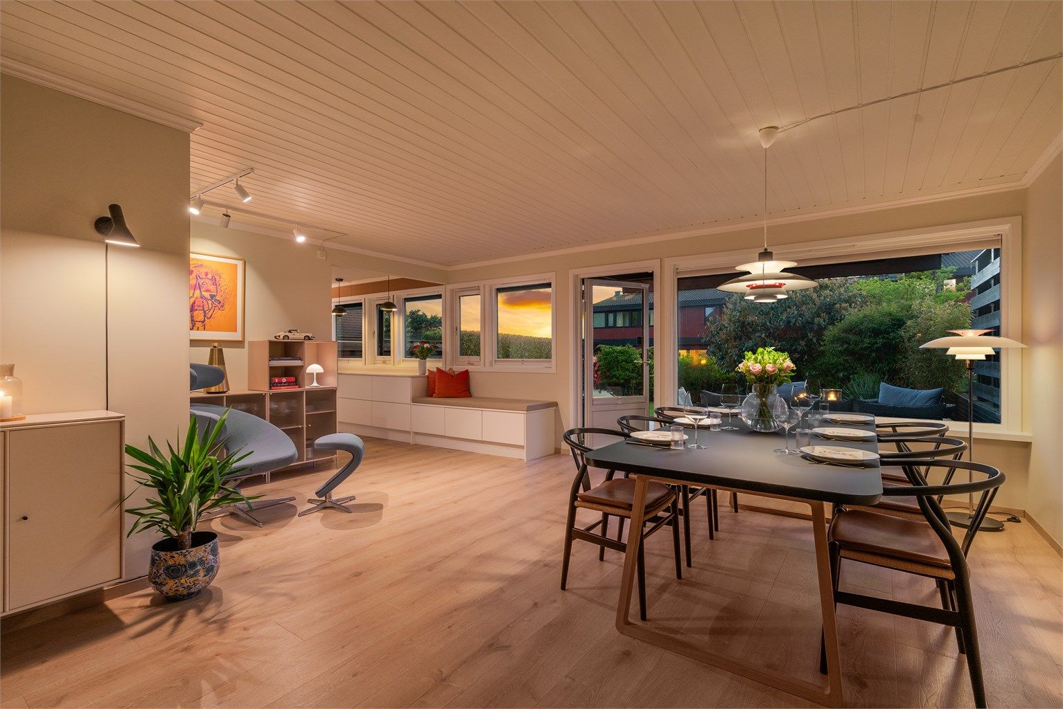 Åpen og lys stue med utgang til overbygget vestvendt terrasse og til hage