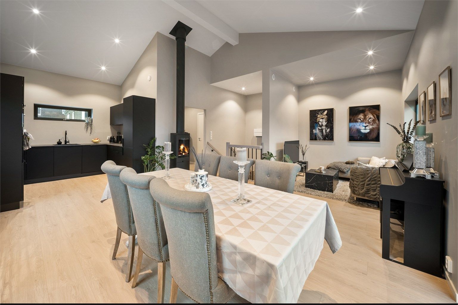 I første etasje er stuen og kjøkkenet sømløst forbundet i en åpen sosial sone på nesten 40 kvm. Sentralt i rommet står en effektiv vedovn som fyller stuen med både varme og stemning. Over trappen til underetasjen er i tillegg varmepumpe smart plassert.