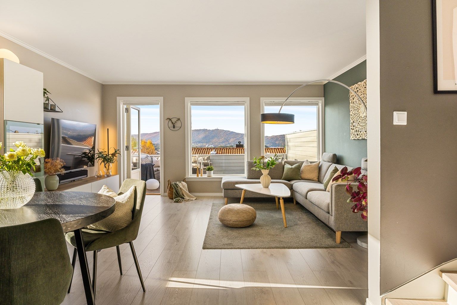 "Trygg, rolig og lun gate. Bolig ligger skjermet for mye vind. Sjøutsikt fra stuevindu og terrasse. Gode oversikt over borettslagets lekeplass fra egen bolig. Flere solfylte uteplasser både på forsiden og baksiden av bolig, samt gressplen med nedfelt trampoline. Kort og trygg vei til både skole, barnehage, buss og butikker med få minutters gange. God parkering på egen plass. Egen inngang fra hage til kjellerstue."