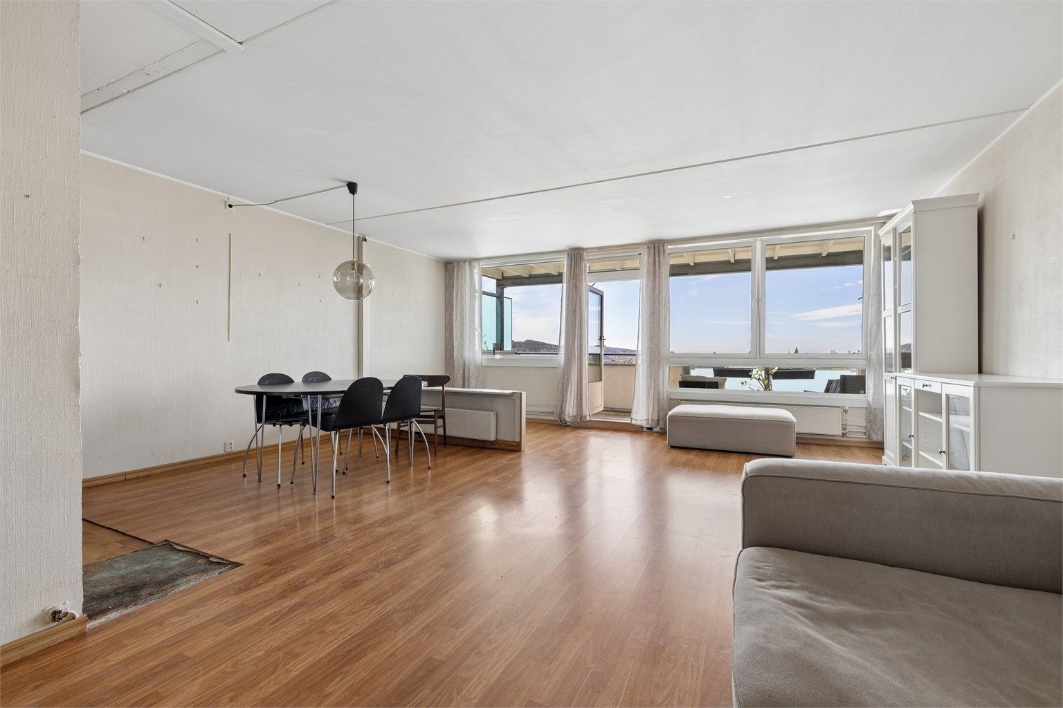 Stuen er leilighetens sterkeste kort. En bred vindusrekke langs hele ytterveggen slipper inn utsikten over åsene og fjorden i horisonten — en utsikt som er synlig fra nesten alle posisjoner i rommet. Plassen gir rom for sofagruppe og spisebord side om side uten at det føles trangt. Fra stuen er det direkte adkomst til balkongen gjennom balkong-/terrassedøren med 3-lags isolerglass. Oppvarmingen skjer via radiatorer langs ytterveggen.