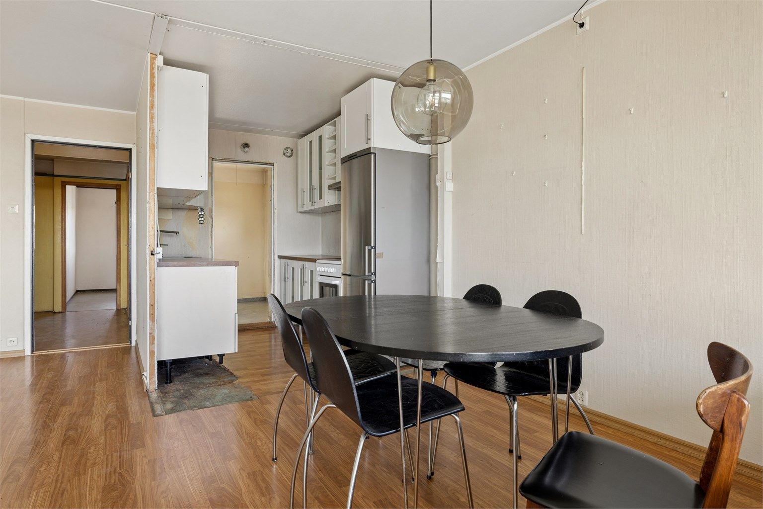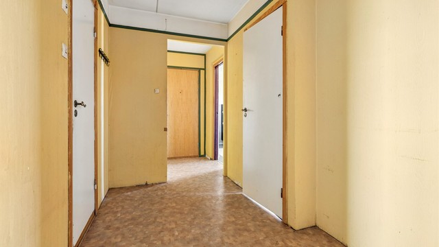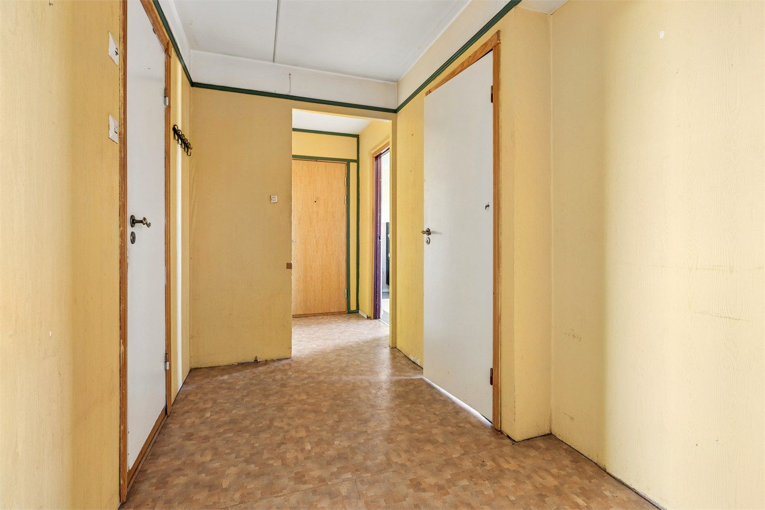 Gangen er romslig for en leilighet av denne typen — bred nok til å ta imot flere dører og gi god bevegelse mellom rommene. Fra entréen åpner leiligheten seg i to retninger: rett frem mot stuen og lyset fra balkongen, og til høyre mot soverommene. Kjøkken, bad, toalettrom og vaskerom nås også herfra. Veggene er malt tapet i gul tone, gulvet er belegg, og innvendige dører er malte glatte innerdører med trekarmer. Overflater og dører har slitasje som gjenspeiler byggets alder.