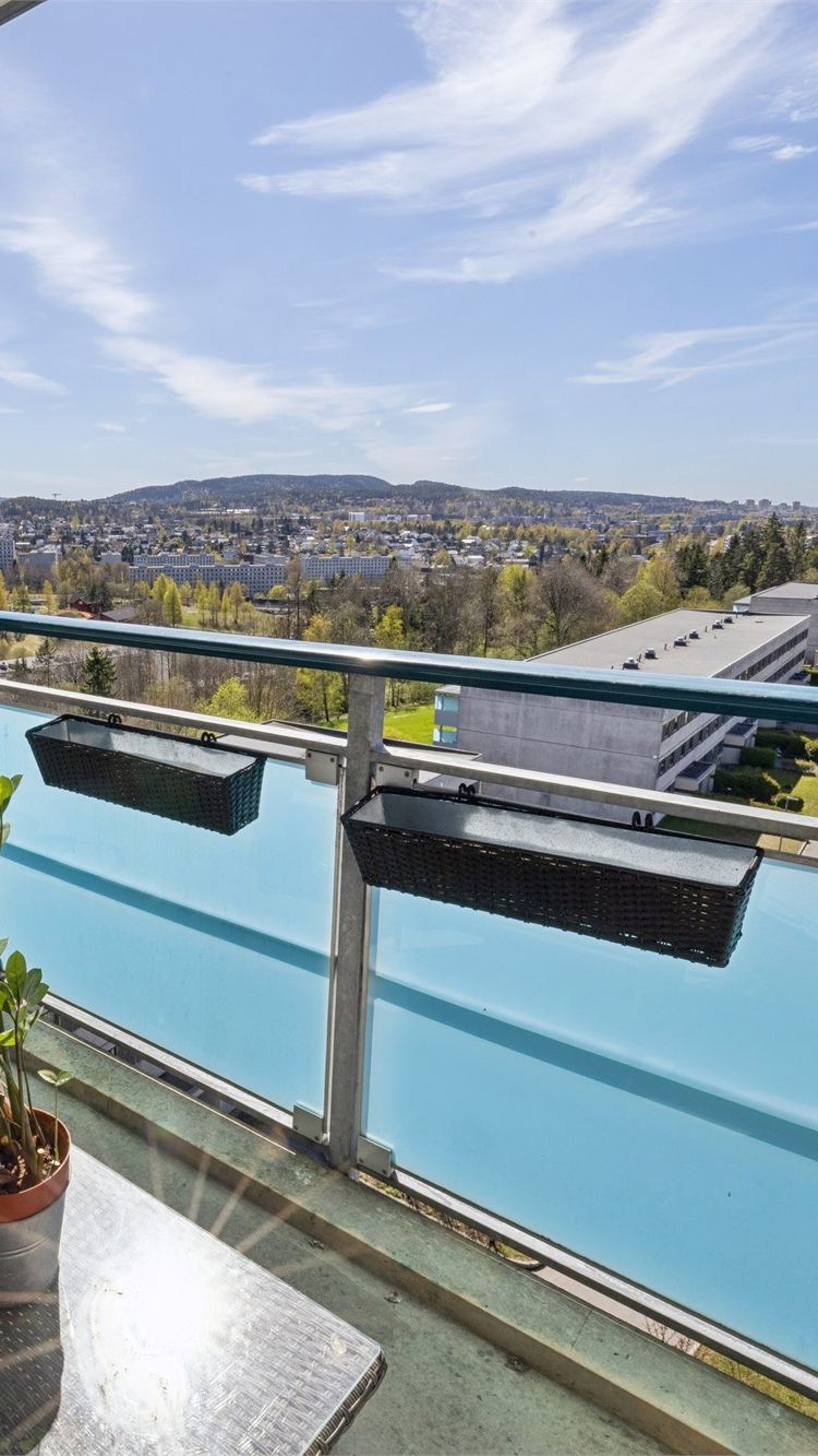 Balkongen har adkomst fra stuen og er bred nok til både sittegruppe og bord. Utsikten herfra er åpen i flere retninger — over nabolaget, skogen og med fjorden i bakgrunnen. Rekkverk i stål og aluminium belagt med plater, med glassfelt som holder utsikten fri. Betongdekke.