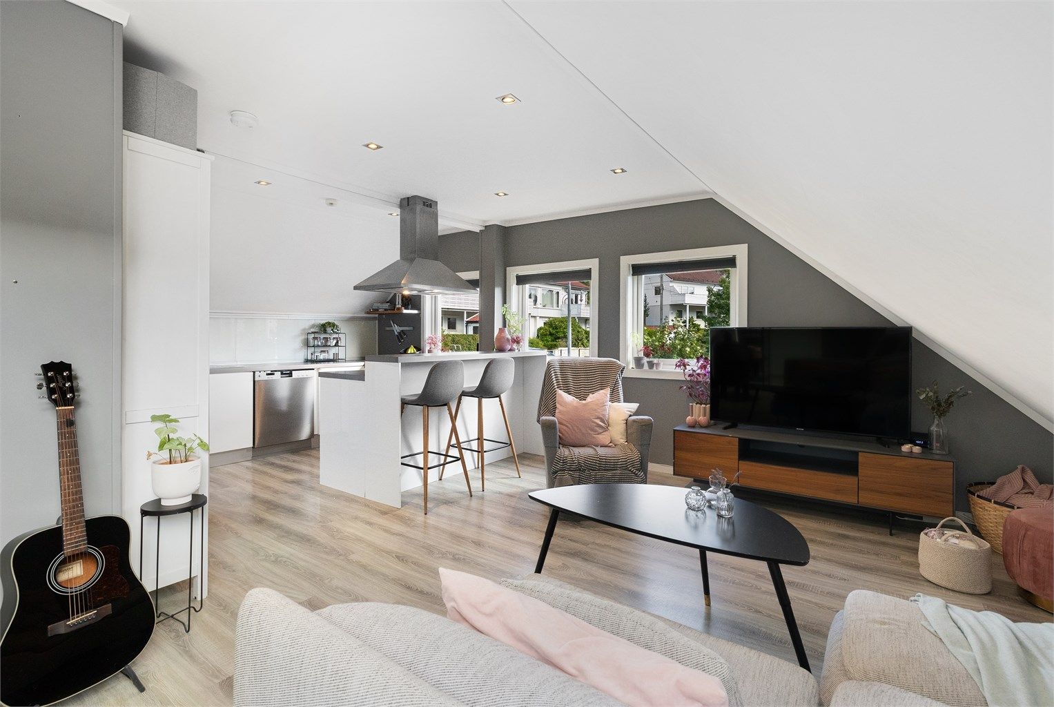 - Hvitt, høyglans kjøkken med oppvaskmaskin, integrert stekeovn og induksjonstopp