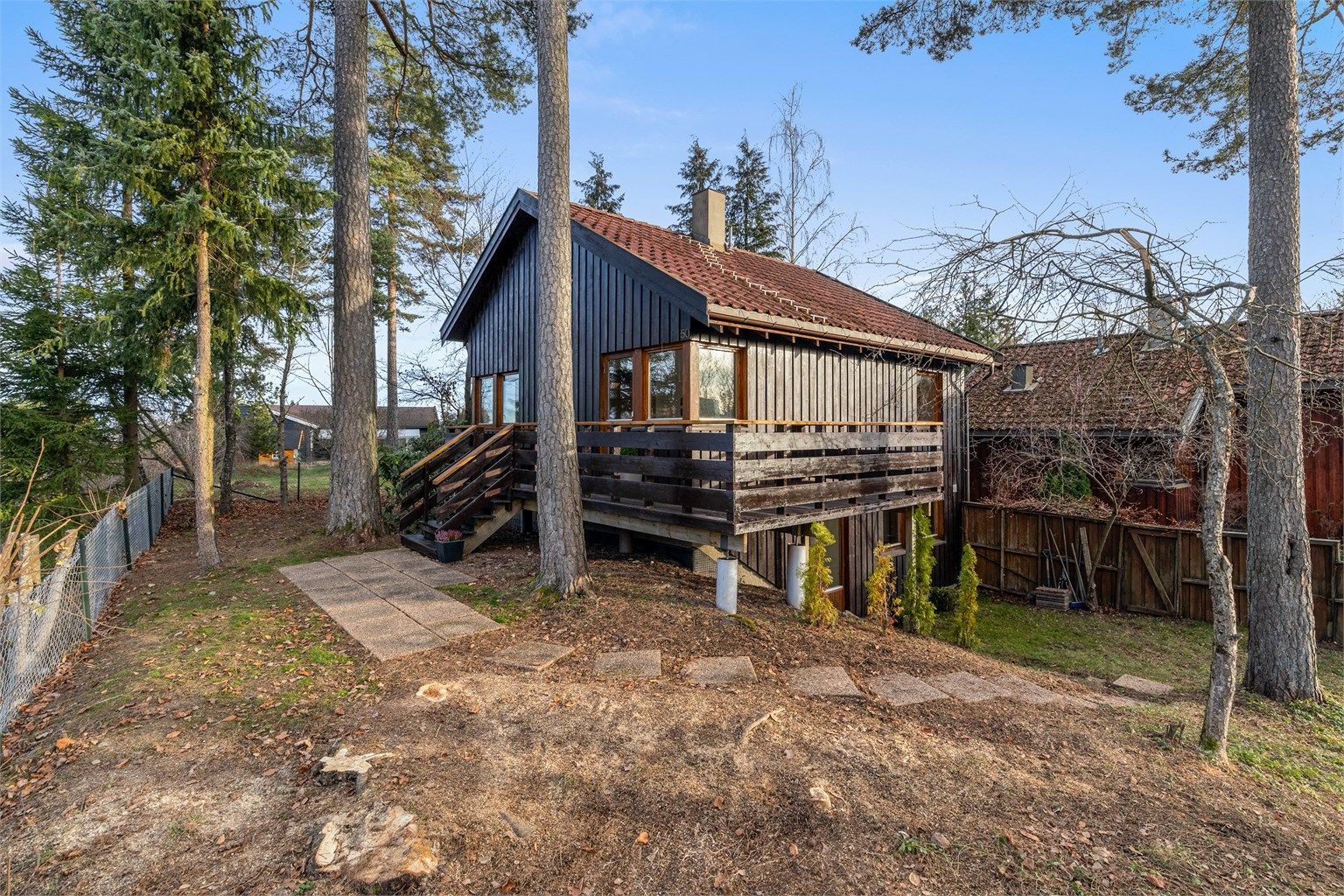 - Terrasser / platting på terreng: Bygningsden har i hovedsak en alder/tilstand som tilsier at gjenværende restlevetid er begrenset. Terrassen er vurdert til å være være underdimensjonert. Det er observert skjevheter i konstruksjonen med pilarer til terrasse og trapp til terreng. Gulvbord har stedvis råte.