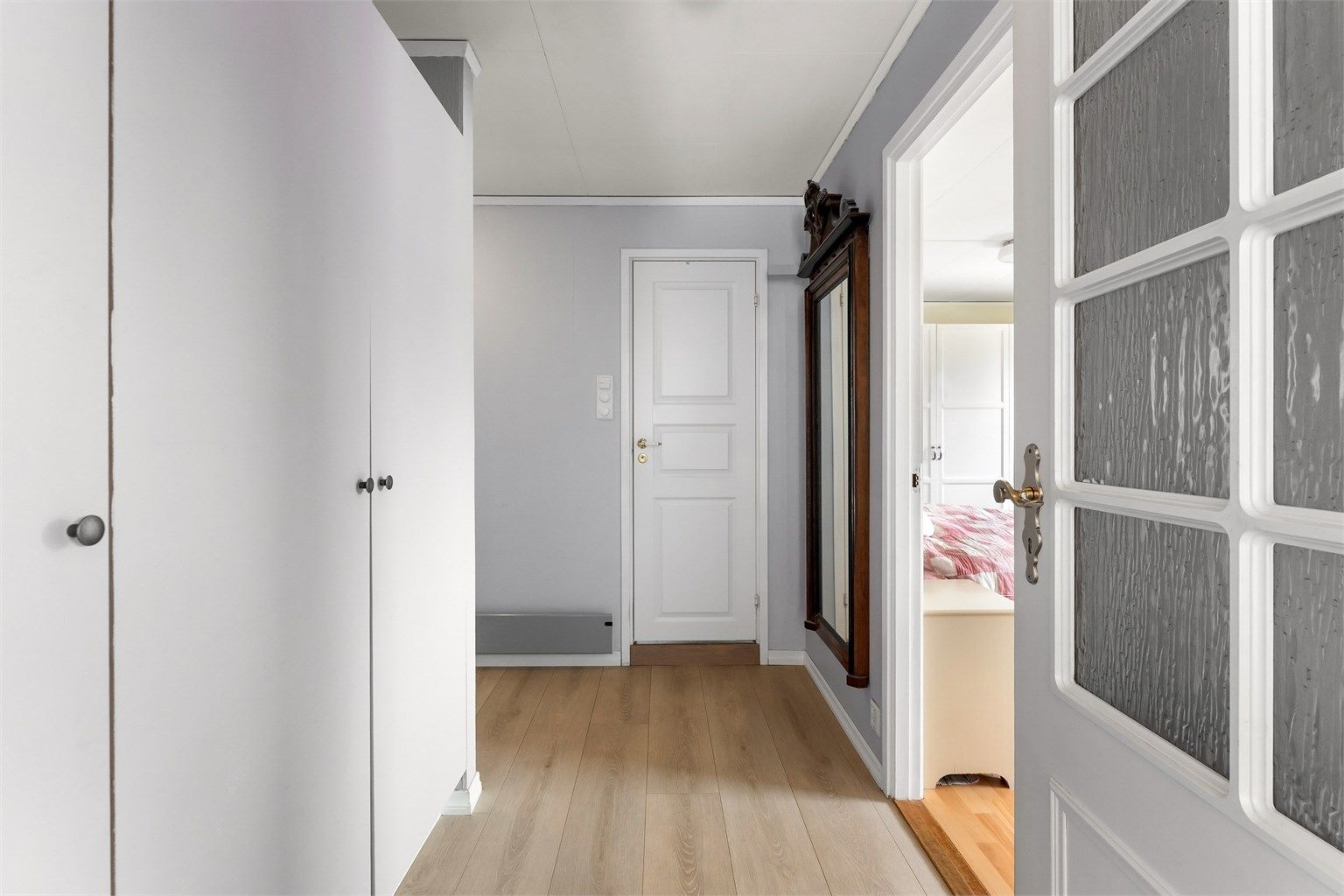 1. etasje 109 kvm: Gang, bad, toalettrom, to soverom, vaskerom, kjøkken, stue og spisestue.